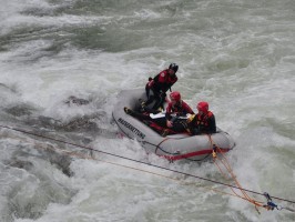 Die Kursteilnehmer haben bereits am zweiten Kurstag den „Wilden Lauffen“, einen Teilabschnitt der Traun mit Wildwasserschwierigkeiten im dritten Grad, bezwingen müssen. Als angehender Wildwasserretter muss man diesen Abschnitt kontrolliert und in vorgegebener Linie schwimmend bewältigen. Im weiteren Kursverlauf wurde sowohl im Trockenen als auch im Nassen der Aufbau von Seilfähren und Flaschenzügen trainiert.