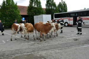 „Feuerwehr & Cowboys – hat das soviel gemeinsam?“ – das dachten sich die Kameraden der Freiwilligen Feuerwehr Gmunden, als sie am Muttertag, 10. Mai 2015 kurz vor 16 Uhr zu einem Tierrettungseinsatz alarmiert wurden. In der Traunsteinstraße irrte eine Rinderherde umher, die Tiere waren zuvor von einer Weide in der Himmelreichstraße ausgebüchst und dürften über die Skitrasse bis zum Bereich der Schiffsanlegestelle Weyer gelangt sein. Gemeinsam mit dem Besitzer wurden die 13 Tiere zusammengetrieben und anschließend vom Bauern abtransportiert.
