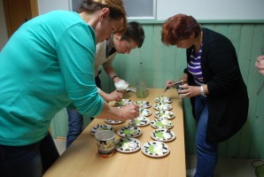 Anschließend wurden die Kräuter im Teamwork gleich verarbeitet. Angefangen vom Chlorophyll-Cocktail, Wildkräutersuppe, mürbes Gebäck mit Wildkräutertopfen, Girschröllchen, Bärlauchspätzle mit Wildkräutersalat.