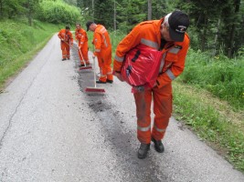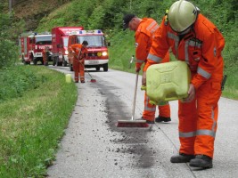 Viel „Manpower“ musste am 18. Juni 2015 zur Beseitigung einer langen Ölspur am Güterweg Muth in Bad Goisern eingesetzt werden. Durch ein technisches Gebrechen an einer Arbeitsmaschine war Hydrauliköl ausgetreten und hatte sich auf der Fahrbahn verteilt.