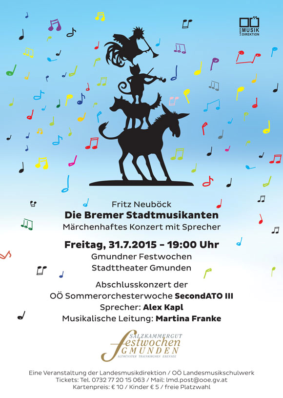 Am Freitag, 31.7.2015 wird im Stadttheater Gmunden im Rahmen der Salzkammergut Festwochen um 19:00 Uhr Fritz Neuböcks neuestes Werk „Die Bremer Stadtmusikanten“ uraufgeführt. Es handelt sich dabei um ein Stück für 4 Solobläser (Klarinette, Fagott, Trompete, Posaune), Streichorchester, Schlagwerkensemble und Sprecher.