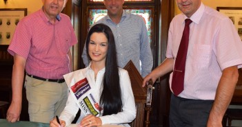 Er habe schon bei seiner Gratulation zur Miss Oberösterreich das Gefühl gehabt, „dass das was wird“, meinte Bürgermeister Stefan Krapf, als er gestern im Namen der Stadt die frischgebackene Miss Austria, Annika Grill, beglückwünschte. Mit ihm stellten sich auch Tourismus-Stadtrat Gerhard Meingast und Tourismus-Direktor Andreas Murray mit Präsenten und guten Wünschen ein. Danach war Annika Grill eingeladen sich ins Goldene Buch der Stadt einzuschreiben.