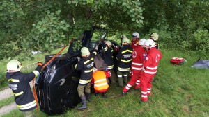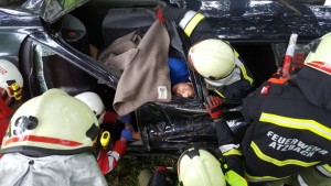 Verkehrsunfall mit mehreren eingeklemmten Personen am Güterweg Reichering lautete das „Einsatzstichwort“ für die Kameraden der Übungsgruppe 2. Nach dem Eintreffen am Einsatzort wurde vom Einsatzleiter die Lageerkundung durchgeführt. Von der Besatzung des ersten Rettungsfahrzeugs wurde die Versorgung der drei verletzen in den zwei verunfallten Autos bereits übernommen.