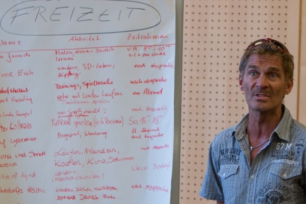 Max Hanke vom Roten Kreuz – er leitet die Betreuung im Männerquartier „Fliegerschule“ – berichtete eingangs über Anzahl und Herkunft seiner Schützlinge. Im Internat Fliegerschule leben jetzt 110 männliche Flüchtlinge aus Syrien und dem Irak. Sie werden vom Roten Kreuz betreut, das sie mit Essen aus der nahen Krankenhausküche versorgt. Tagsüber sind BetreuerInnen in der Fliegerschule anwesend. Ergänzend ist ein Bereitschaftsdienst rund um die Uhr verfügbar. Insgesamt kann das Rote Kreuz auf ein 50-köpfiges Team zurückgreifen.