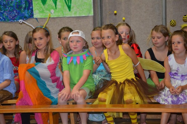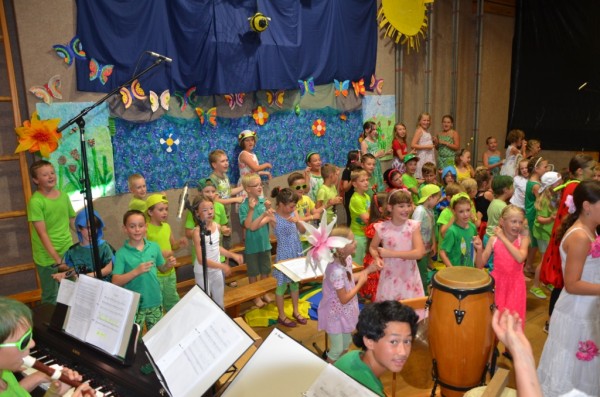 Das Stück wurde vom hauseigenen Komponisten und Musikpädagogen VS Dir. Walter Kienesberger komponiert und von der Chorleiterin Annemarie Hauer getextet. Die Kinder der 4. Klassen stellten die verschiedenen Charaktere dar und spielten auf zahlreichen Instrumenten. Rund 70 Kinder von der Vorschule bis zur 4. Klasse sangen trotz tropischer Temperatur konzentriert und voller Begeisterung mit. Und sie hatten viel zu bieten: Ein musikalisches Spektakel vom Feinsten!! Auf diesem Weg noch einmal herzlichen Dank an alle Mitwirkenden, alle Helfer und an die zahlreichen Besucher. Es war ein großartiges Erlebnis.
