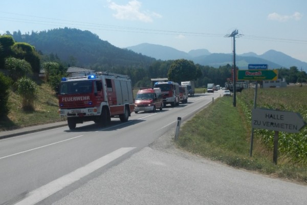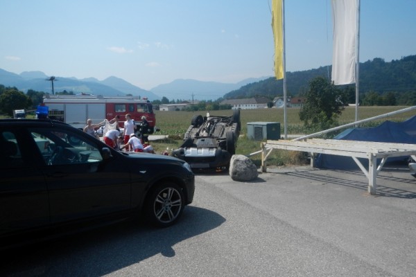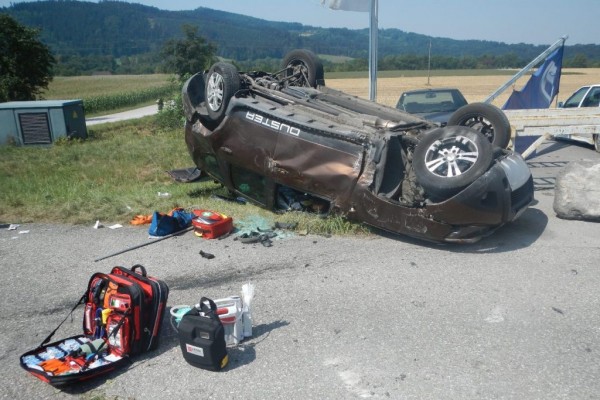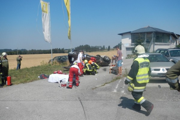 Am Freitagmittag, 14.08.2015 wurde die Feuerwehr Scharnstein um 11:51 Uhr von der Landeswarnzentrale gemeinsam mit der Feuerwehr Steinfelden zu einem Verkehrsunfall eingeklemmte Person in das Gemeindegebiet von Pettenbach alarmiert. Aus unbekannter Ursache stießen 2 PKW zusammen, wobei ein PKW am Dach zum Liegen kam. Beim Eintreffen der Feuerwehr waren die verletzten Personen bereits geborgen. Die Feuerwehr Scharnstein sicherte die Einsatzstelle ab, unterstützte das Rote Kreuz bei den Versorgungsmaßnahmen und übergab im Anschluss die Einsatzstelle der örtlich zuständigen Feuerwehr Steinfelden, die nach Abschluss der Erhebungsarbeiten die Aufräumungsarbeiten durchführten.