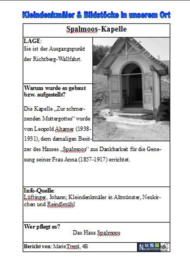 Im Zuge der Vorbereitungsarbeiten zur Verleihung des Prädikates „Naturpark- Schule“ betätigten sich die Schüler der 3. und 4. Klassen der NMS Neukirchen als Heimatforscher. Sie erkundeten im Unterrichtsfach Deutsch die Entstehungsgeschichte von Kleindenkmälern in der Nähe ihres Wohnortes, indem sie Internet und einschlägige Literatur durchsuchten und auch Verwandte befragten. Natürlich setzten sie dabei auch ihre Handys ein. Das Ergebnis präsentierten sie in einer Ausstellung in der NMS Neukirchen.