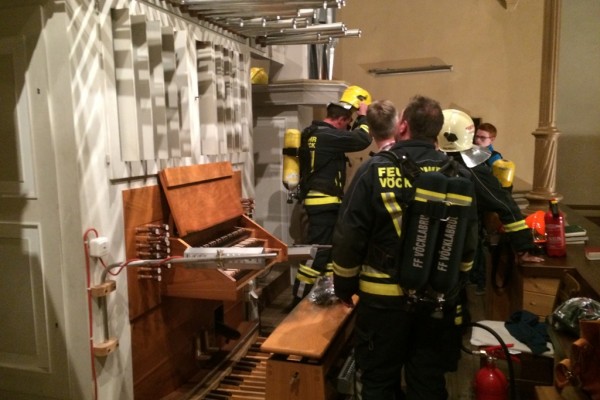 Die FF Vöcklabruck wurde zu einem Brand in die evangelische Kirche gerufen. Im Bereich der Orgel wurde eine Rauchentwicklung gemeldet. Der erste Atemschutztrupp erkundete die Lage und konnte vorerst keinen Auslösegrund feststellen. Die Orgel wurde mit der Wärmebildkamera abgesucht, wobei keine Erwärmung festgestellt werden konnte. Nach Rücksprache mit den anwesenden Kirchenmitgliedern wurde der Einsatz beendet.