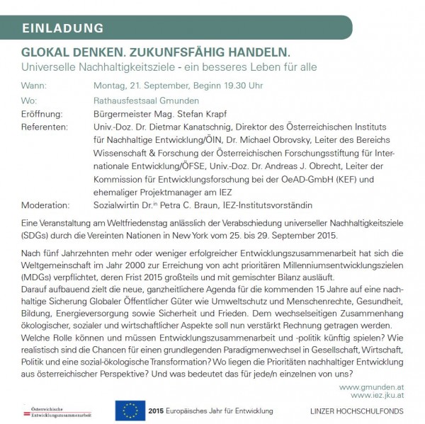 Anlässlich der Verabschiedung universeller Nachhaltigkeitsziele (SDGs) durch die Vereinten Nationen in New York vom 25. bis 29. September 2015 lädt IEZ-Vorständin Dr.in Petra C. Braun im Europäischen Jahr für Entwicklung zur mittlerweile neunten öffentlichen Veranstaltung im Raum Gmunden dieses Mal am Weltfriedenstag in den Rathausfestsaal Gmunden.