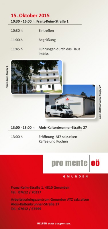 Endlich ist es soweit: Nach umfangreichen Adaptierungsarbeiten im ehemaligen Gebäude der oö. Gebietskrankenkasse in der Franz-Keim-Straße 1 wird am 15. Oktober 2015 ab 10.30 Uhr der neue Standort der psychosozialen Angebote von pro mente oö offiziell eröffnet.