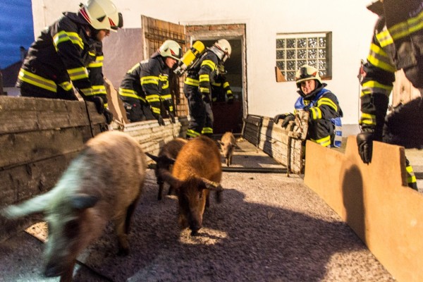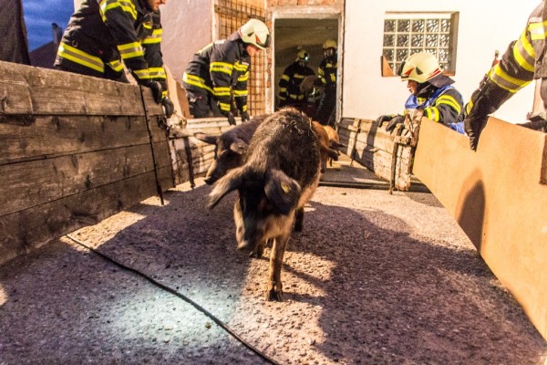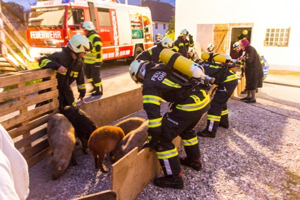 Beim zweiten Versuch ließen sich die Tiere behutsam ins Gehege treiben. Wichtig war es behutsam und ruhig mit den Tieren zu arbeiten. Heftige Bewegungen bzw. die Tiere in Stress zu versetzen sollten verhindert werden. Schweine und andere Tiere können im Ernstfall schnell auf stur schalten und dann nicht mehr das tun was man als Einsatzkraft möchte. Zeitgleich wurde von außen ein Löschangriff gestartet. Die Wasserversorgung wurde von einem nahe gelegenen Hydranten sichergestellt.