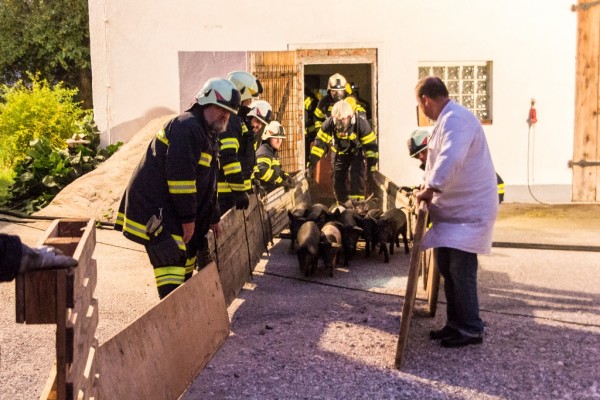 Der angenommene Brand entstand im Bereich der Stallungen welche von den Einsatzkräften geräumt werden musste. Zwei Atemschutztrupps erkundeten im Inneren die Lage und das Verhalten der kleinen Schweine. Es wurden Überlegungen angestellt wie man am besten die Schweine nach draußen in ein anderes Gehege bringen könnte. Die einzige Lösung war einen Gang mit Pfosten und Bretter zu erstellen und die Schweine dadurch zu treiben. Der erste Versuch scheiterte und ein Teil der Schweine trat den Rückweg an.