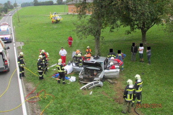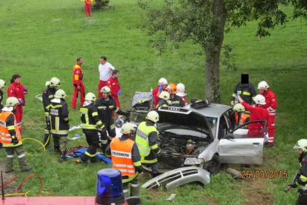 Eine schwer verletzte Person musste von der Feuerwehr mittels hydraulischem Rettungssatz aus dem Fahrzeug befreit werden.