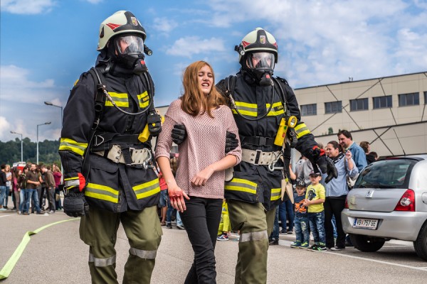 Während von drei Stellen – dem Schulzentrum, dem Lagerhaus und dem 1 Kilometer entfernten Baggersee – Löschwasser herbeigeschafft wurde, gingen weitere Einsatzkräfte unter Einsatz von schwerem Atemschutz unverzüglich an die Bergung der 130 in drei stark verrauchten Sälen versammelten Kinobesucher. 24 wirklichkeitsnah geschminkte „Verletzte“ unter ihnen wurden von den Florianijüngern geborgen und sofort vom Roten Kreuz versorgt und für den Weitertransport in die umliegenden Krankenhäuser vorbereitet.