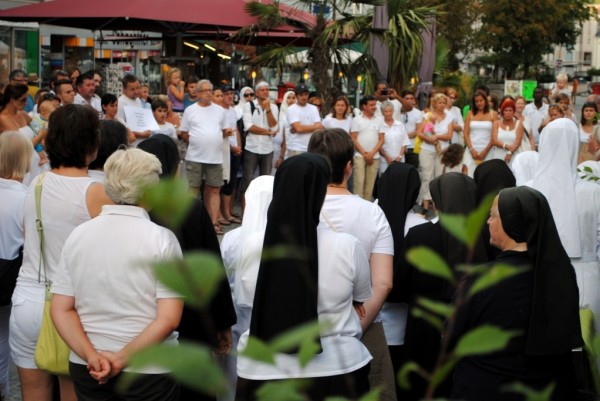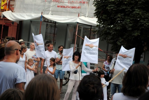 Über 250 Menschen folgten dem Aufruf des Aktionskomitees „Mensch sein“ zu einer Kundgebung am Stadtplatz in Vöcklabruck am 1. September. Unter ihnen auch der Abg. der Grünen Gottfried Hirz und die Oberin der Franziskanerinnen Sr. Angelika Garstenauer. Tiefe Betroffenheit über die 71 Flüchtlingsopfer auf der A4 und Solidarität mit Menschen, die vor Krieg und Terror flüchten waren die Beweggründe für diesen Akt der Solidarität.