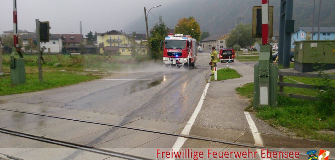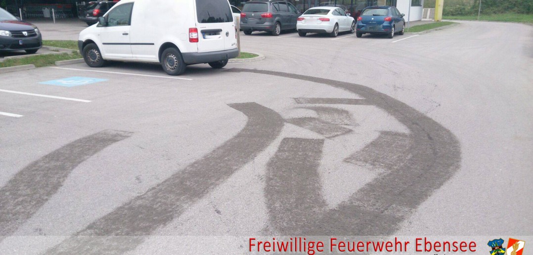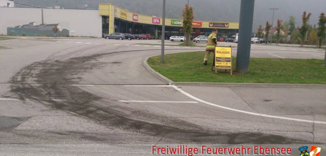 Am Dienstag, 13.10.2015 wurden die Kameraden der FF-Ebensee um 11:31 Uhr zu einer 250m langen Ölspur alarmiert. Aus unbekannter Ursache löste sich die Schraube der Motorölwanne eines PKW vor der Bahnübersetzung Rindbachstraße. Da dies der Fahrer nicht sofort bemerkte, fuhr dieser noch über den kompletten Parkplatz des Einkaufzentrums und zog so eine ca. 250m lange Ölspur.