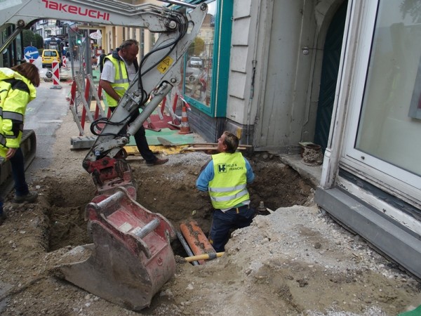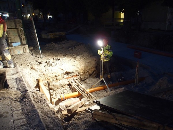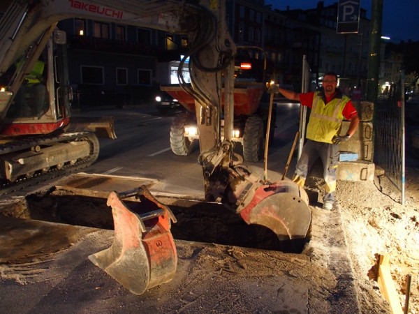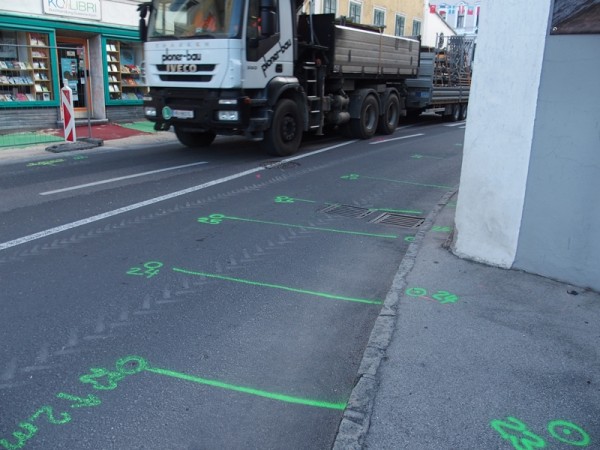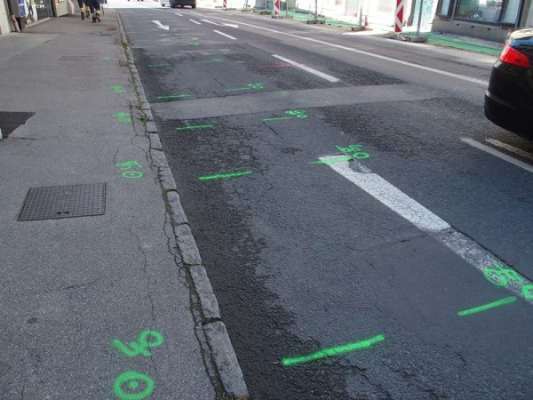 In der Engstelle wurde am Gehsteig der zweiten Straßenseite der Asphalt abgetragen und die Markierungen für das Düsenstrahlverfahren wurde auf der Straße gesetzt. Zuvor werden aber noch die Kanal-Hausanschlüsse in diesem Bereich saniert – wie die Kamerabefahrung und auch die eine oder andere Grabung in dieser Woche bestätigt haben, ist dies von dringender Notwendigkeit…
