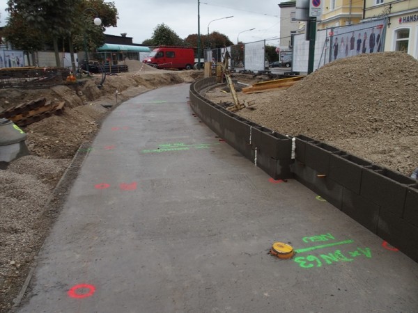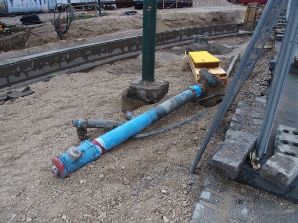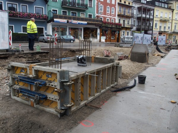 Dienstagabend wurde die Hydrantenleitung erneuert und im Bereich der Haltestelle wuchsen die Fundamente für die Überdachung. Auch Schalsteine für den weiteren Aufbau der Gleistragplatte wurden schon gesetzt.