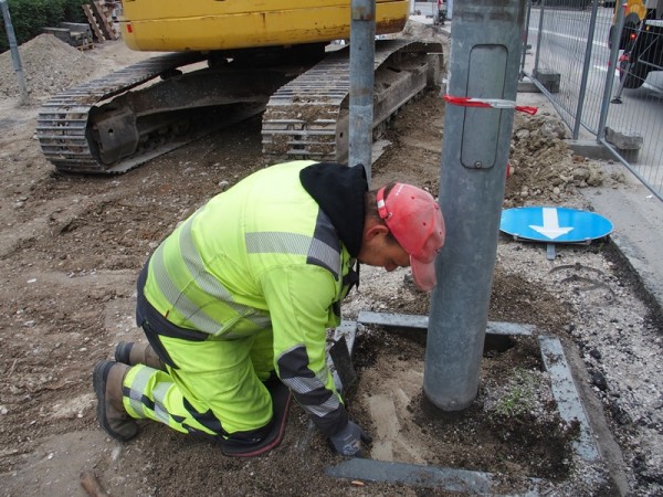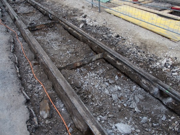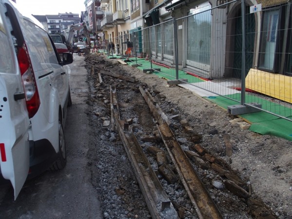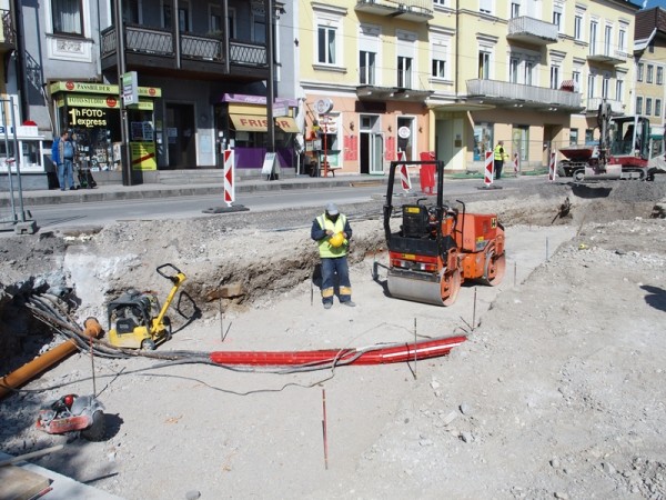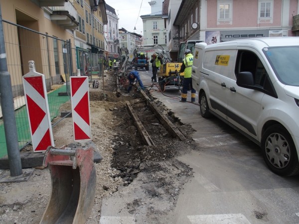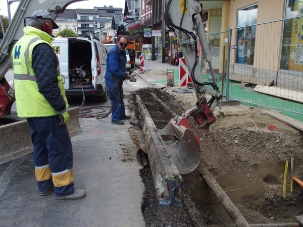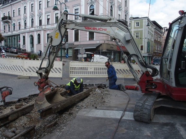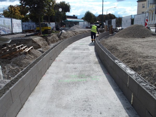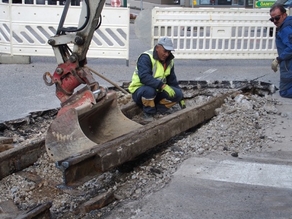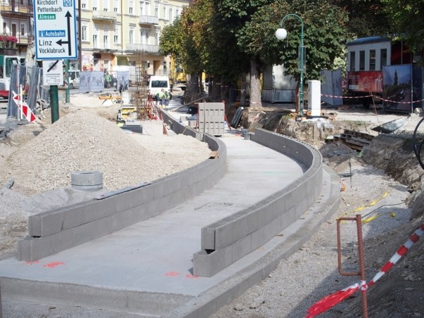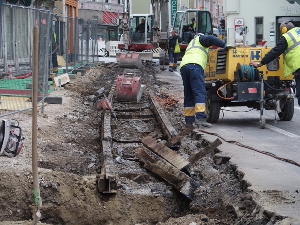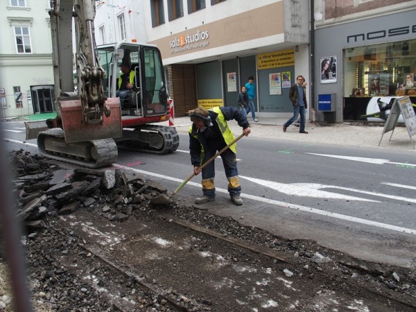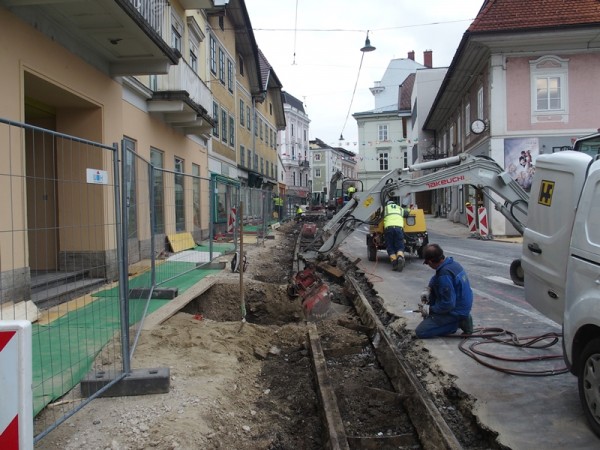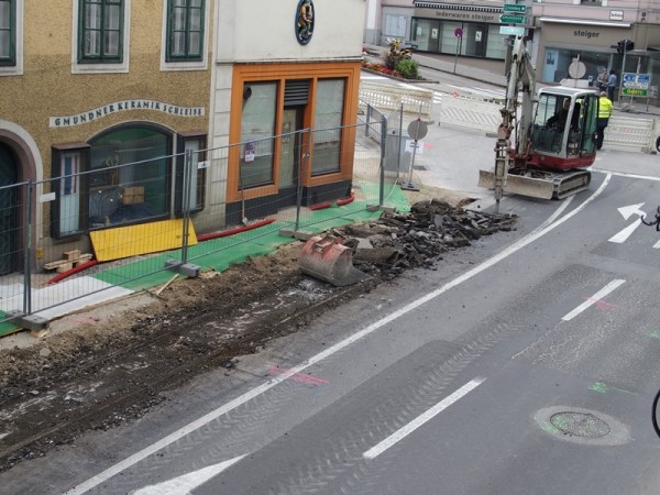 Am Montag stand ein historischer Moment am Programm. Im Bereich der Engstelle wurden die alten Schienen ausgegraben, die seit der Verkürzung der Linie Mitte der 70er Jahre dort unter dem Asphalt schlummerten. Ebenfalls in der Engstelle wurden alle Kanal-Hausanschlüsse saniert, damit es bei der Ausführung des Düsenstrahlverfahrens in KW 41 nicht zu bösen Überraschungen kommen kann. An der zukünftigen Haltestelle wurde die Gleistragplatte betoniert und auch die Säulen für das Haltestellendach wurden mit Beton gefüllt. Bis zum Wochenende wurden alle großen Gruben wieder verschlossen.