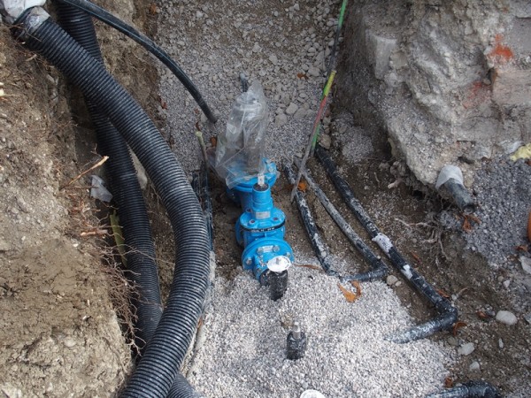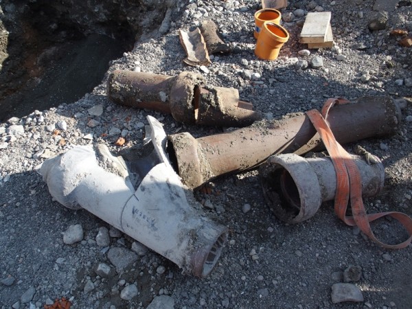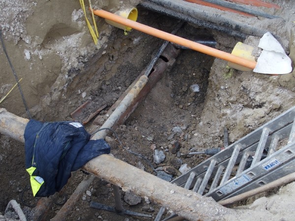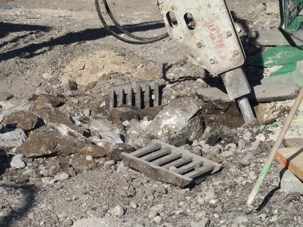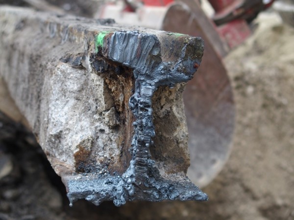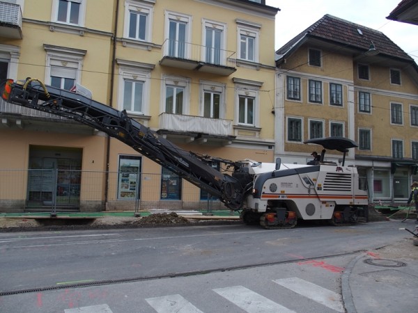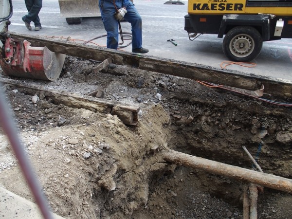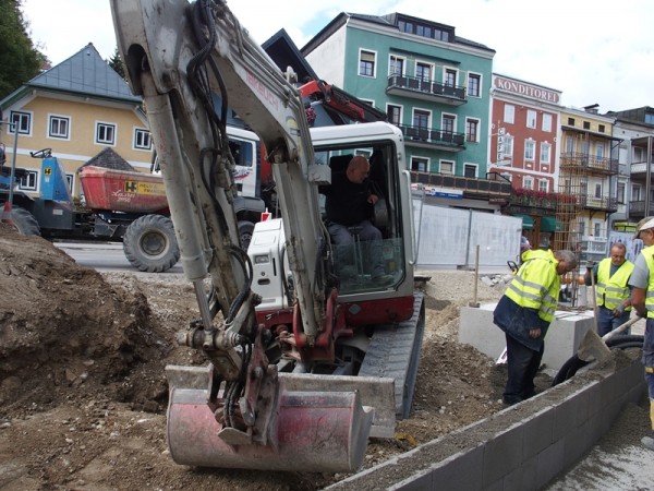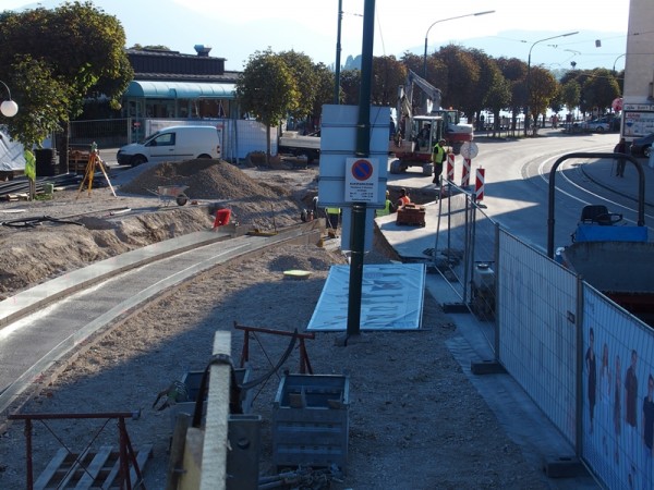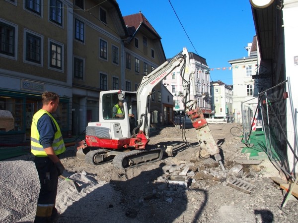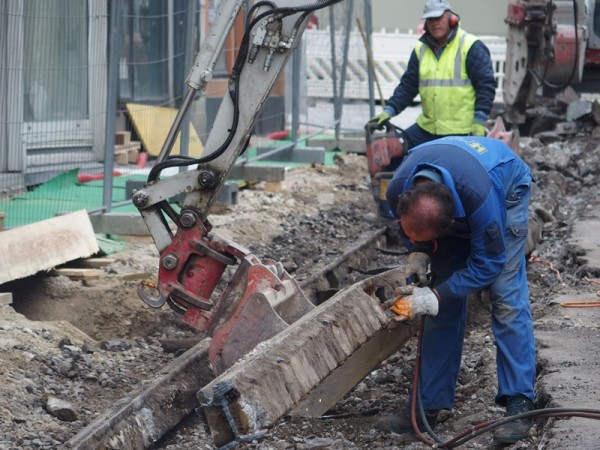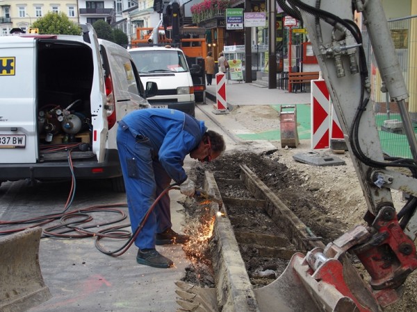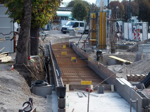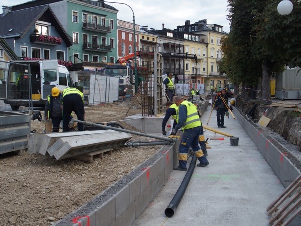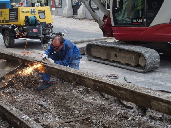 Am Montag stand ein historischer Moment am Programm. Im Bereich der Engstelle wurden die alten Schienen ausgegraben, die seit der Verkürzung der Linie Mitte der 70er Jahre dort unter dem Asphalt schlummerten. Ebenfalls in der Engstelle wurden alle Kanal-Hausanschlüsse saniert, damit es bei der Ausführung des Düsenstrahlverfahrens in KW 41 nicht zu bösen Überraschungen kommen kann. An der zukünftigen Haltestelle wurde die Gleistragplatte betoniert und auch die Säulen für das Haltestellendach wurden mit Beton gefüllt. Bis zum Wochenende wurden alle großen Gruben wieder verschlossen.