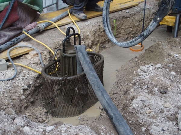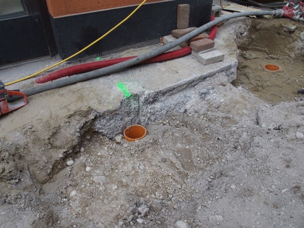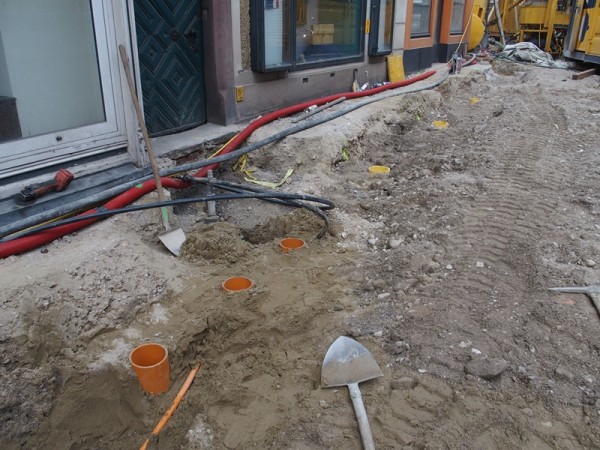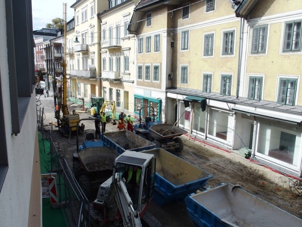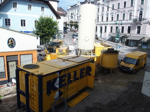 Ebenfalls Anfang dieser Woche kam die Firma Keller Grundbau mit zusätzlicher Baustelleneinrichtung und startete das Düsenstrahlverfahren zur Gebäude- und Baugrubensicherung im Bereich der Engstelle zwischen Tiefgarageneinfahrt und Grabenkreuzung.