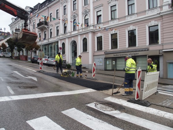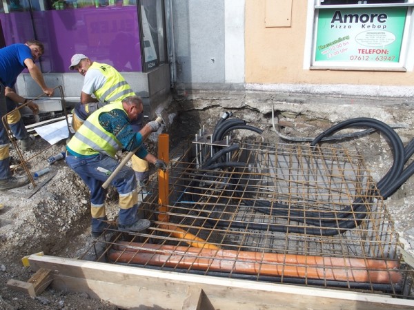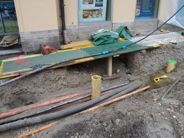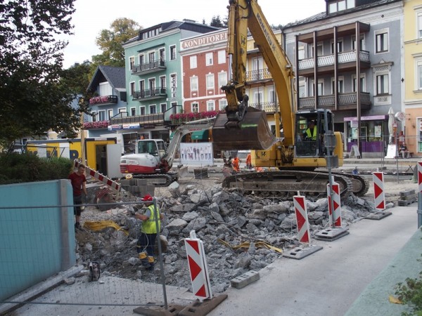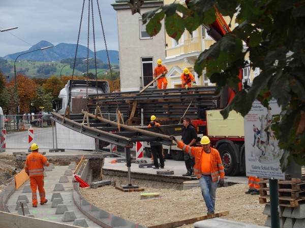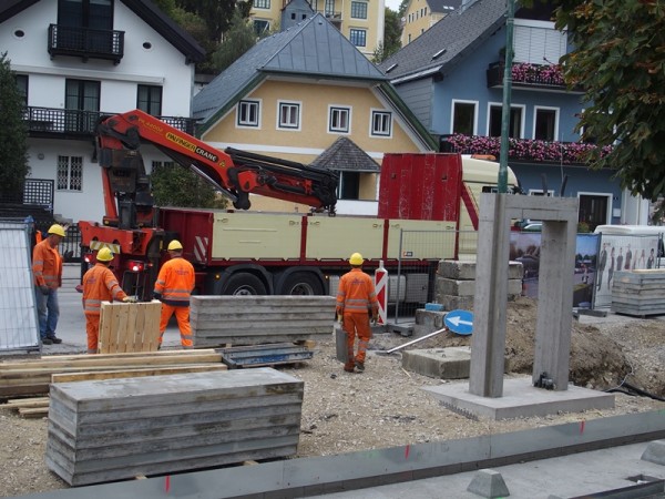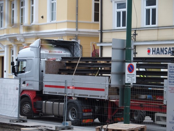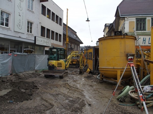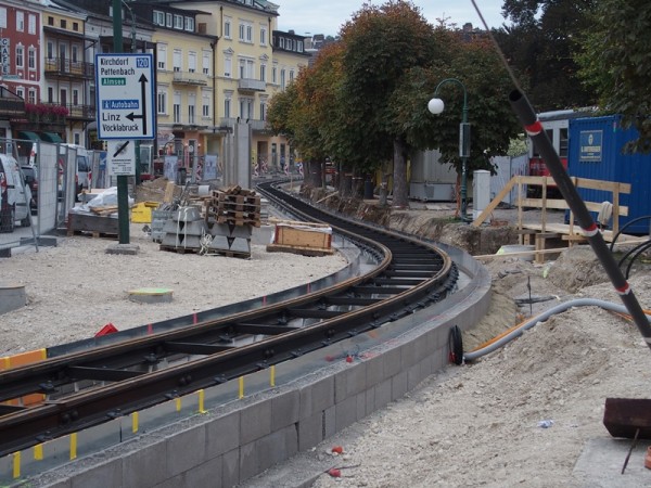 Zum Beginn der Woche wurde auch die Straßenbahnhaltestelle um ca. 150 m in Richtung Altmünster verlegt – an der „kleinen/alten Haltestelle“, die wir ja auch in Zukunft für die Fahrtrichtung stadtauswärts brauchen, wurde nämlich auch schon aufgegraben. Dort entsteht ein neues Fundament, worauf dann der dort nötige Mast und die Haltestelle mit Infosäule platziert werden.