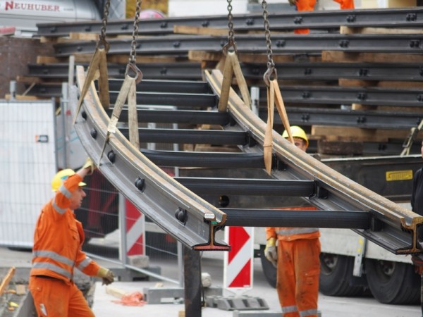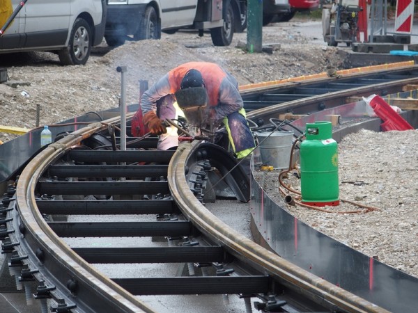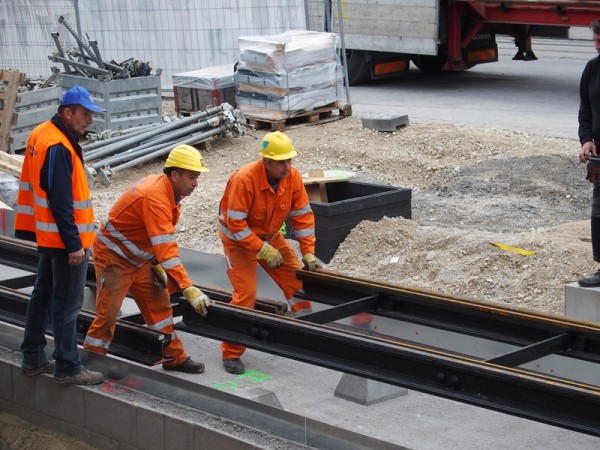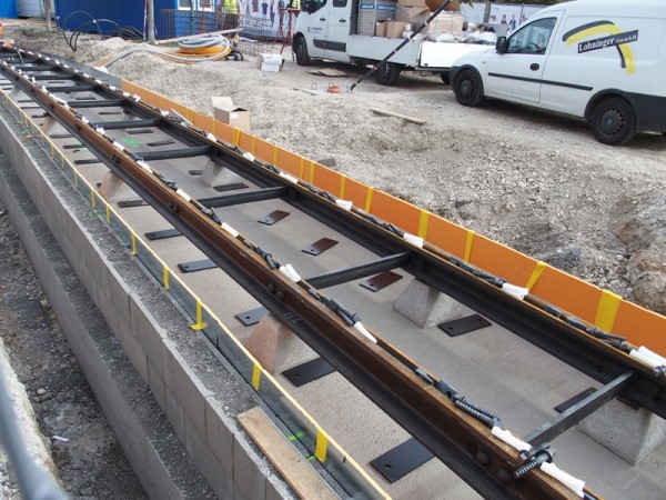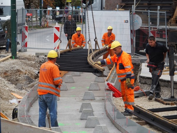 Kaum ist man mal auch nur einen einzigen Tag nicht da, kommt man auch schon kaum noch mit dem Schauen nach, so viel tut sich auf der Baustelle. Diese Woche wurden schon die Schienen für den gesamten Haltestellenbereich angeliefert. Kurz darauf ging es dann schon ans Einrichten und Verschweißen und nächste Woche soll alles schon soweit sein, dass sie sogar schon einbetoniert werden können.