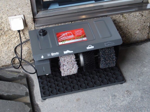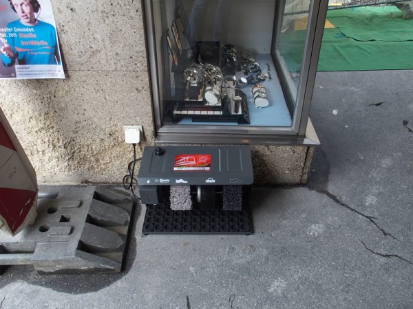 Tja, und für alle, die trotz der grünen Teppiche an schmutzigem Schuhwerk leiden, haben wir bei „Foto Moser“ im Durchgang an der Ecke eine Schuhputzmaschine aufgestellt, die (zu den Geschäftszeiten von Foto Moser) jedem Baustellenpassanten Verfügung steht.