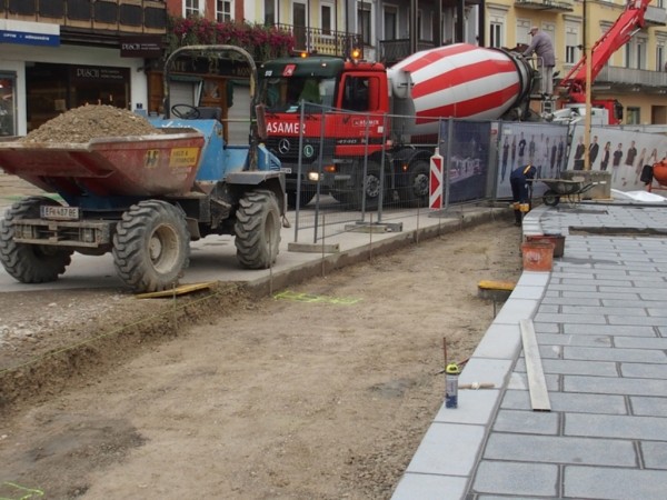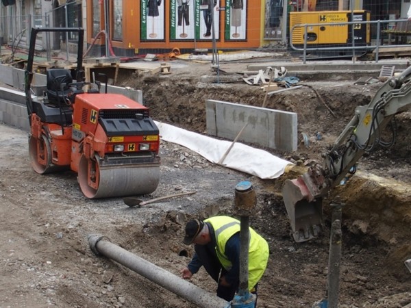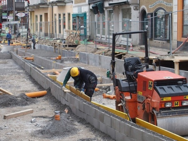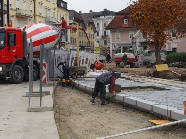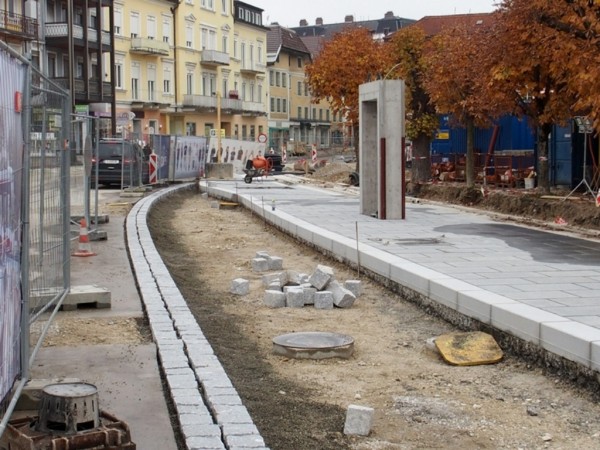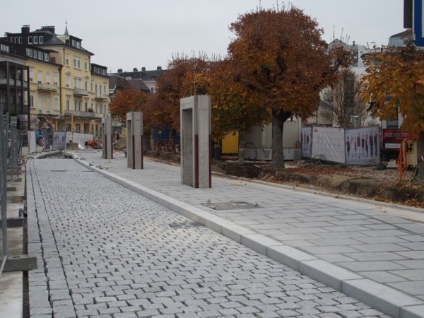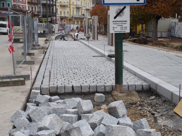 Trotz Nationalfeiertag, kann sich der Baufortschritt mehr als sehen lassen. An der Haltestelle wurden Pflastersteine verlegt, die nun neben dem schon fertig gepflasterten Bahnsteig auch die neue Bushaltestelle zieren. Hier wird sich in Kürze Platz für drei Busse und auch für eine Ladezone finden.