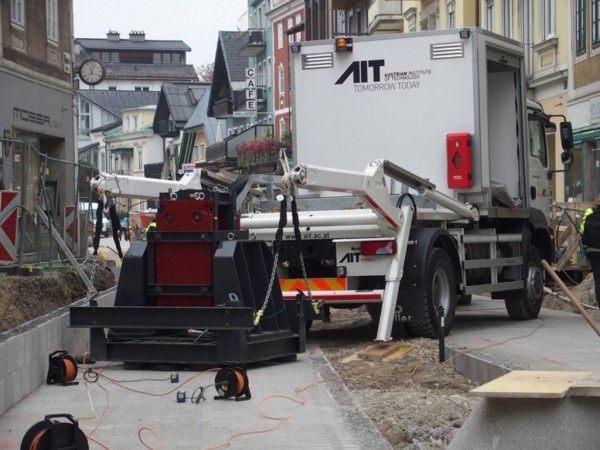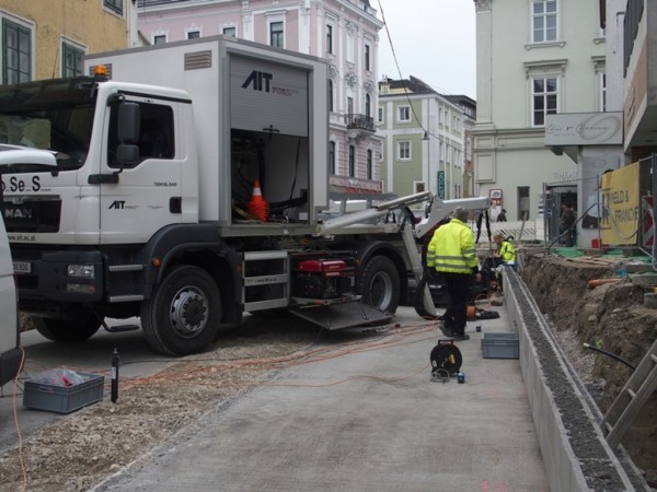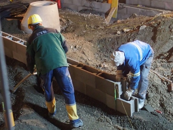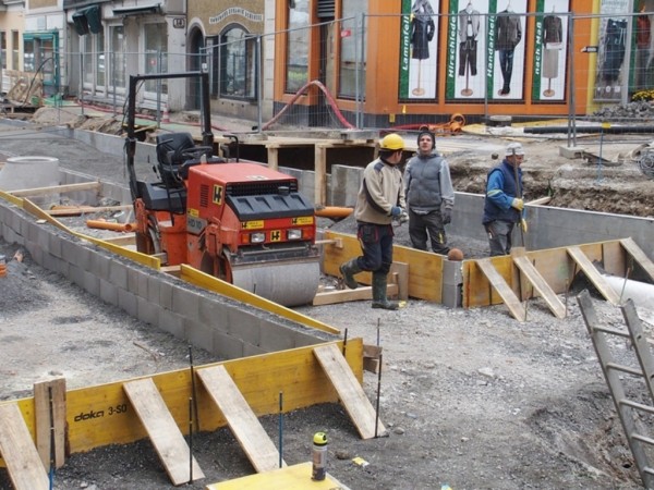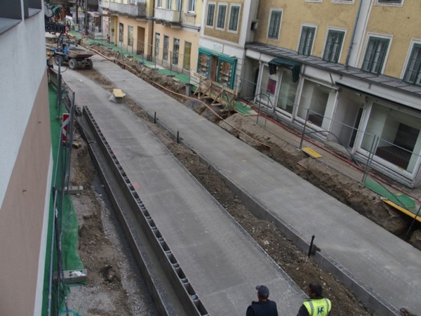 Den größten Anlass zum Staunen bot letzte Woche allerdings das Geschehen in der Engstelle: Am Dienstag wurden noch Rohre verlegt und bis in die Dunkelheit die letzten Schalsteine gesetzt, am Mittwoch dann beide Grundplatten zur Gänze betoniert. Am Freitag kam zum wiederholten Mal des Schwingungsmesser “ MoSeS“ zum Einsatz, dessen Ergebnisse entscheidend für den weiteren Aufbau des Gleiskörpers und den optimalen Erschütterungsschutz sind.