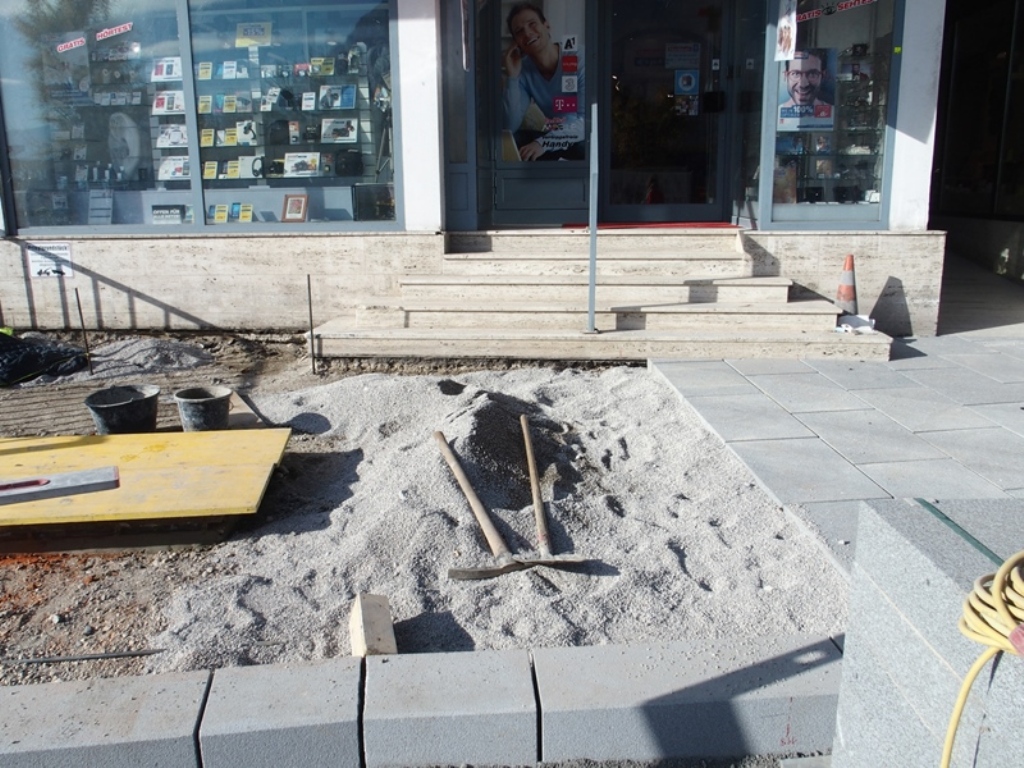 Gleich am Montagmorgen wurde die Dachkonstruktion der neuen Haltestelle angeliefert und montiert. In der Engstelle wurden die Matten für das Masse-Feder-System (Erschütterungsschutz) verlegt, die Schutzbetonschicht aufgetragen. Am Mittwoch wurden die Schienen für das Gleis in Richtung stadteinwärts angeliefert. Im Bereich der Grabenkreuzung konnte mittlerweile der Schacht für die Wasserversorgung betoniert werden. Und am Franz-Josef-Platz wurden alle Randleistensteine gesetzt und auch schon ein Großteil der Gehsteigfläche gepflastert.