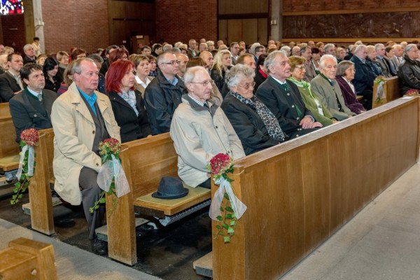 Nach einem Erinnerungsfoto vor dem Hochaltar waren alle zu einemgroßzügigen Festmahl, ausgezeichnet zubereitet von den Goldhaubenfrauen, in den Pfarrsaal eingeladen. So ergab sich wiederum eine gemütliche und besinnliche Stimmung, als von so manchen gleichlang verheirateten Jubelpaaren auf die schnell vergangenen Jahrzehnte zurückgeschaut wurde.