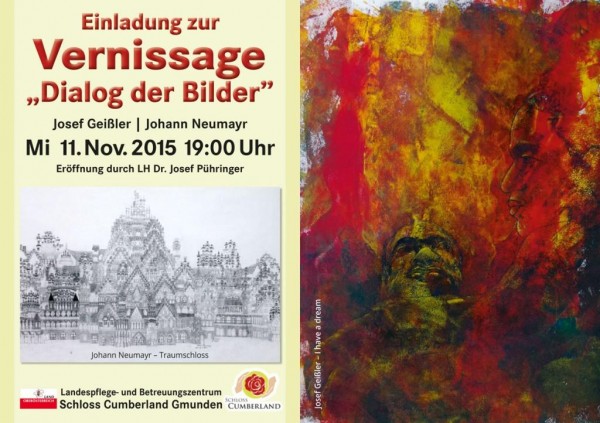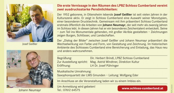 Der in Ottensheim lebende Maler Josef Geißler ist seit vielen Jahren in der Kulturszene aktiv und zeigt seine Werke erstmals im Salzkammergut. Im Schloss Cumberland stellt er seine Monotypien, eine besondere Technik des Malens, vor. Daneben gehört seine Liebe der Federzeichnung – Geißler ist auch begnadeter Karikaturist – und dem Aquarell. Gemeinsam mit ihm präsentiert erstmals Johann Neumayr öffentlich seine Arbeiten. Neumayr ist seit mehr als zwanzig Jahren Bewohner des Schlosses. In diesen Jahren hat er ein besonderes Zeichentalent entwickelt. Seine – zum Teil ins monumentale gehenden, mit großer Akribie gestalteten – Zeichnungen zeigen Burgen, Schlösser und Landschaften.