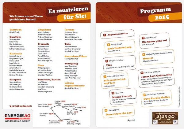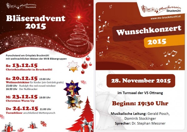 Der Musikverein Bruckmühl lädt alle Musikbegeisterten zum Wunschkonzert am 28.11.2015 um 19:30 Uhr in den Turnsaal der Volksschule Ottnang ein. Vor dem Konzert so wie auch in der Pause werden Sie mit einem kleinen Snack und kühlen Getränken versorgt. Eintrittskarten sind bei jedem Musiker und an der Abendkassa erhältlich. Der Musikverein Bruckmühl freut sich über Ihren Besuch und wünschen Ihnen einen schönen Konzertabend.