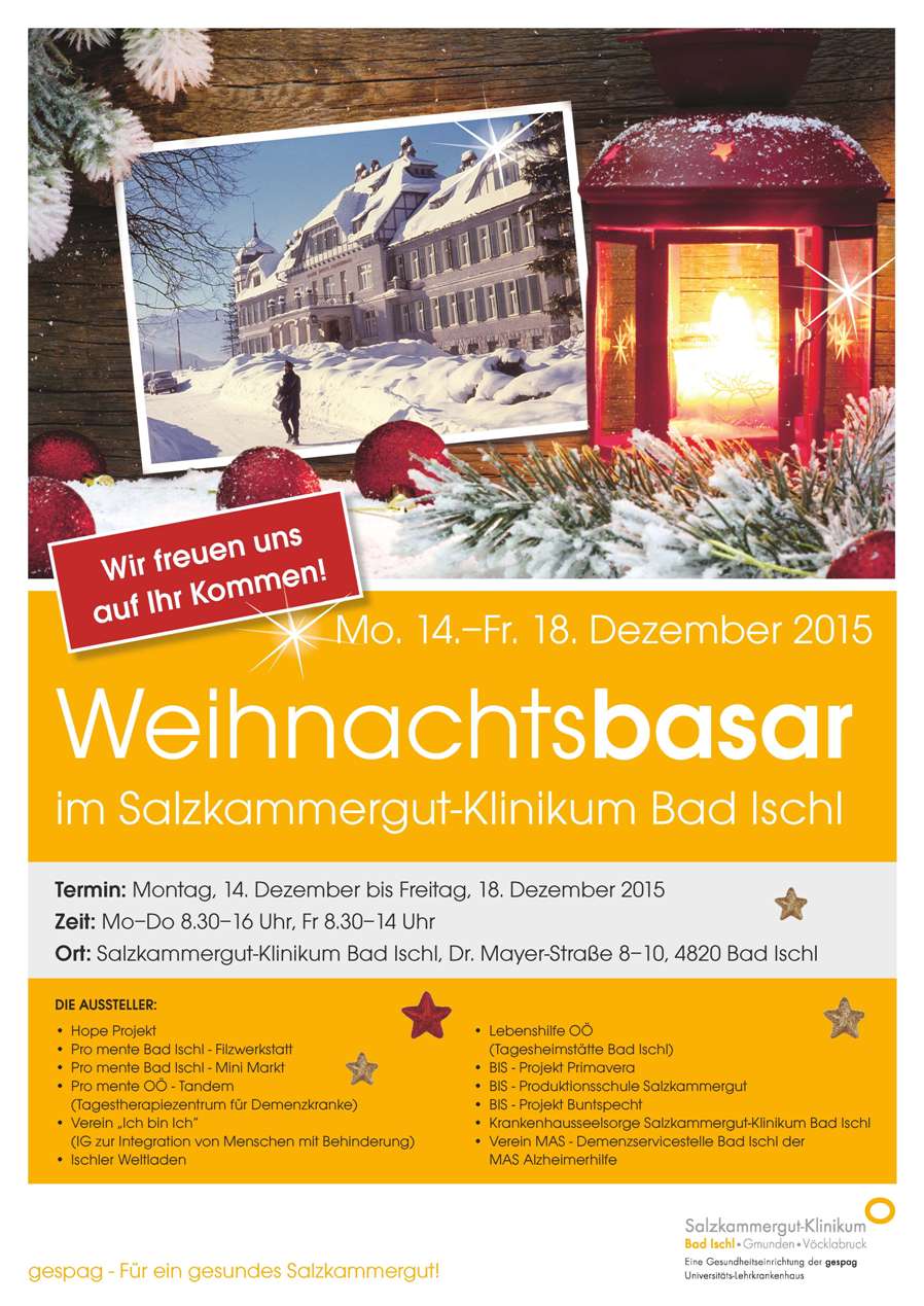 Wie jedes Jahr laden auch heuer wieder zahlreiche Stände, die von der Stadtgemeinde Bad Ischl zur Verfügung gestellt werden, zum Bummeln ein. Hochwertige und kreative Filzprodukte aus heimischer Schafwolle werden ebenso angeboten wie allerlei Selbstgemachtes (Marmeladen oder weihnachtliches Gebäck). Kreatives aus Ton und Holz gibt es zu sehen, aber auch Zier- und Handwerksgegenstände, Strickwaren, Kerzen und Gestecke. Krankenhausseelsorger Mag. Josef Schmidinger beteiligt sich ebenfalls am Adventmarkt. Es gilt das Gemeinschaftsgrab für Fehl- und Totgeburten, das betroffenen Familien die Möglichkeit bietet, in einem würdigen Rahmen von ihren verstorbenen Kindern Abschied zu nehmen, finanziell zu unterstützen. Die teilnehmenden Sozialeinrichtungen sowie das Salzkammergut-Klinikum Bad Ischl laden herzlich zu diesem Weihnachtsbasar, der ganz im Zeichen der Nächstenliebe steht, ein.
