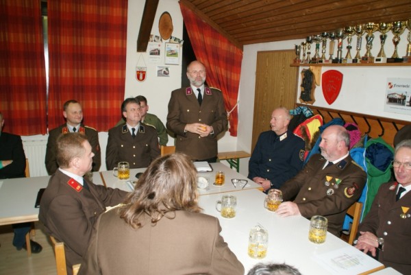 Bgm. Mag. Reiter bedankte sich in seiner Ansprache für die Bereitschaft zur Ausbildung und Übungen um für die Einsätze bestens gerüstet zu sein. Weiters berichtete er über den Stand der Dinge bezüglich des Feuerwehrhausumbaus und wies in diesem Zusammenhang auf einen Termin Anfang Februar bei der Landesregierung hin. Er gratulierte zur Angelobung sowie den Beförderten und Ausgezeichneten und abschließend sagte er Feuerwehrjugend wieder eine Unterstützung von 300€ zu.