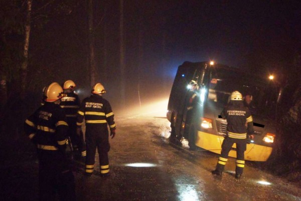 Aufgrund der extremen Straßenverhältnisse konnte der Reisebuslenker die Fahrt nicht mehr fortsetzen. Aus diesem Grund wurden die 60 Festgäste von der Feuerwehr im Pendelverkehr von der Rettenbachalm zum Reisebus nach Bad Ischl transportiert.