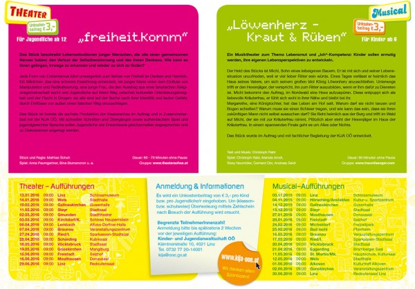 Seit Jänner 2016 wird auch in allen Bezirken Oberösterreichs das Theaterstück „freiheit.komm“ für Jugendliche ab 12 Jahren aufgeführt (Theatergruppe Theaterachse).