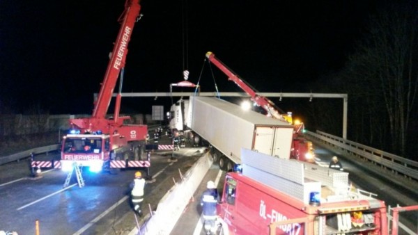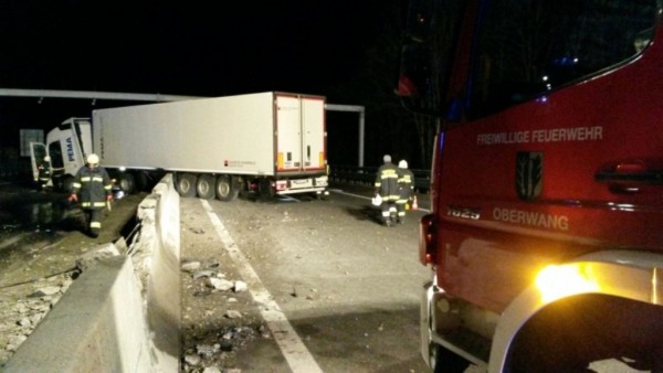 Im Gemeindegebiet Straß im Attergau kam er aus bisher ungeklärter Ursache von der Fahrbahn ab. In der Folge touchierte er die Leitschiene und durchbrach anschließend die Betonmittelleitwand. Das Sattelkraftfahrzeug blieb zwischen den Richtungsfahrbahnen hängen und blockierte beide Fahrstreifen. Der 33-jährige Lenker wurde durch den Verkehrsunfall leicht verletzt und von der Rettung in das Krankenhaus Vöcklabruck gebracht. Aufgrund der Beschädigungen traten aus dem Sattelzugfahrzeug Öl und Diesel aus, welche von der Feuerwehr gebunden bzw. abgepumpt wurden.