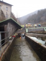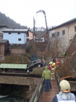 Nach dem Trockenlegen des Zulaufs, wurde das verunfallte Fahrzeug unter einer Brücke durchgeschoben, um es mit den beiden Kränen heraus heben zu können.Durch den raschen Einsatz der Feuerwehren Lauffen und Bad Ischl konnte ein Austreten von Betriebsmitteln und somit eine Umweltgefährdung verhindert werden.