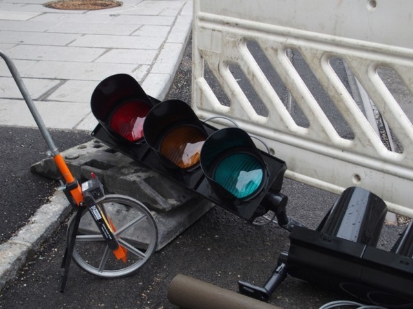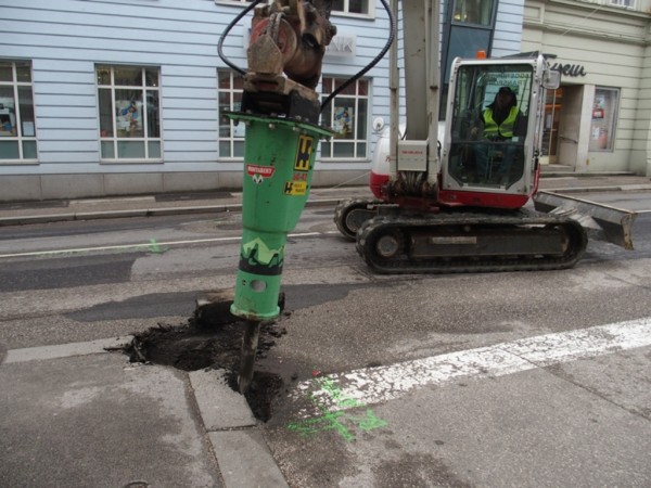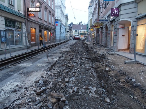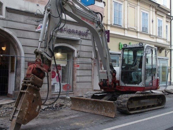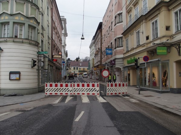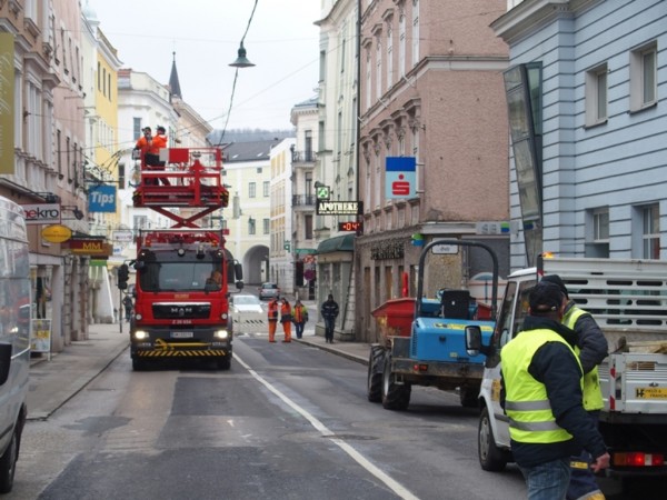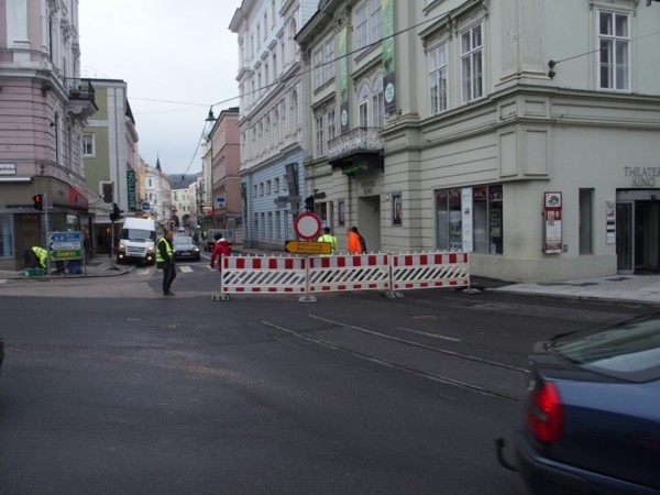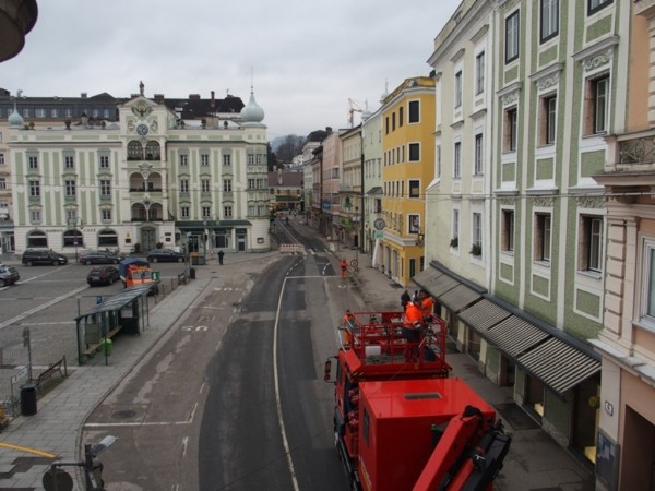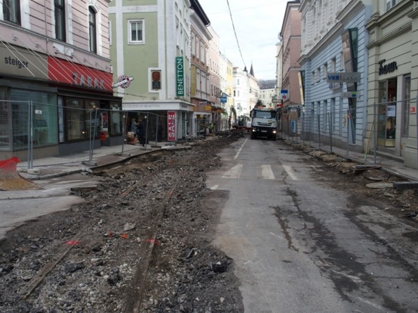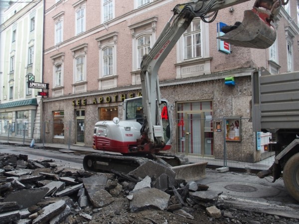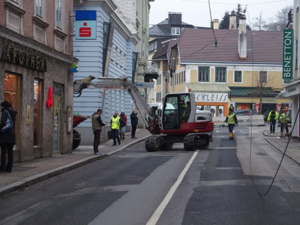 Es ist soweit: Die Baufirma Held & Francke ist wieder in Gmunden und hat das neue Baufeld in der Theatergasse zwischen Grabenkreuzung und Rathausplatz (sowie derzeit auch an der Esplanade für den Einbau der Weiche) abgesteckt.