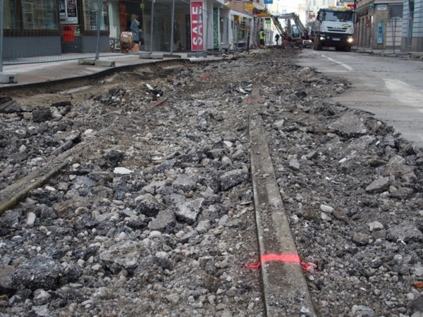 Nun wurde auch die bis dahin noch immer bis zum Rathausplatz vorhandene alte Fahrleitung demontiert und flugs begannen unsere Arbeiter damit, den Asphalt abzutragen und auch die dazugehörigen Schienen freizulegen, die da seit Mitte der 1970er Jahren ungenutzt als stille Zeugen vergangenener Fahrten vor sich hinschlummerten. Sie haben ihren Dienst getan und dürfen Platz für die neue Gleisanlage machen, die in diesem Abschnitt bis Ende Juli fertiggestellt werden soll. Bis dahin gibt es aber noch eine Menge anderer Dinge zu tun und so haben auch schon die Vorarbeiten für die anstehenden Arbeiten an den Einbauten begonnen.
