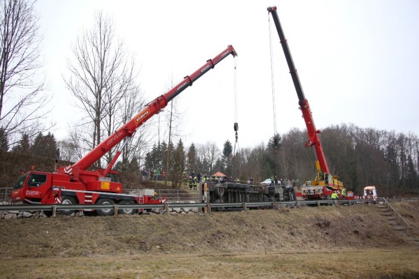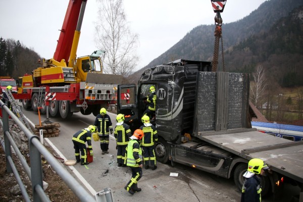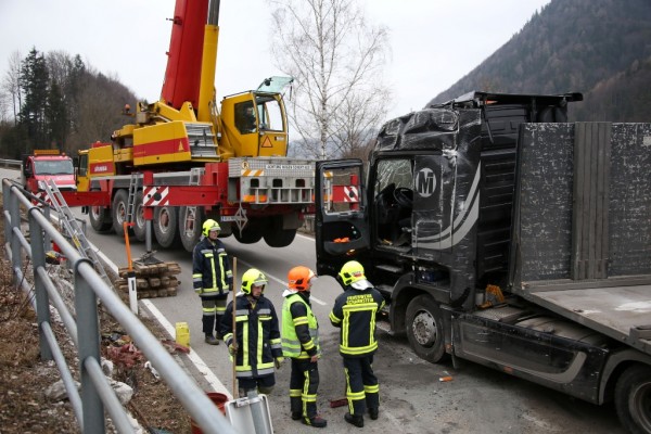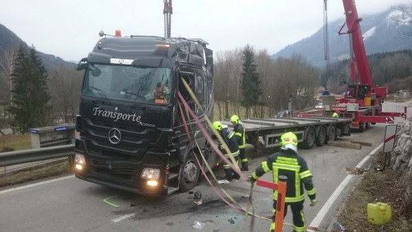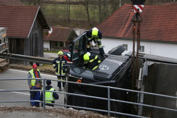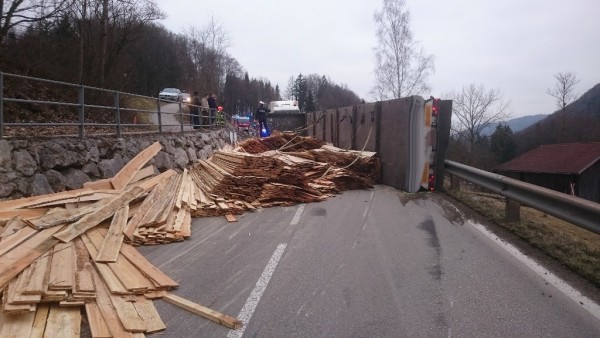 Aus bisher noch unbekannter Ursache stürzte ein Lkw mit Anhänger am 18. Februar 2016 auf der Almseelandesstraße um. Ein 23-Jähriger aus Ohlsdorf lenkte den Lkw gegen 14 Uhr auf der Almseelandesstraße Richtung Scharnstein. Unmittelbar nach einem Bahnübergang kam das Fahrzeug ins Wanken und kippte samt Anhänger und Schnittholzbeladung zur Seite. Der 23-Jährige wurde mit Hilfe von Zeugen aus dem Lkw befreit. Er wurde unbestimmten Grades verletzt und von der Rettung in das Salzkammergut-Klinikum Gmunden gebracht.