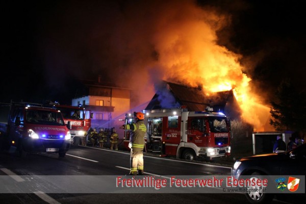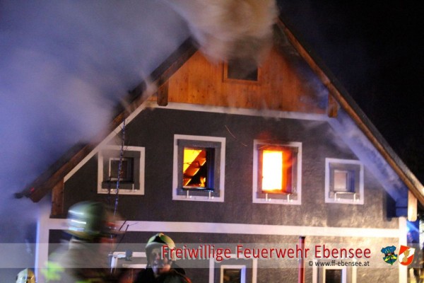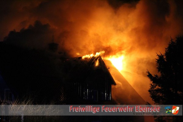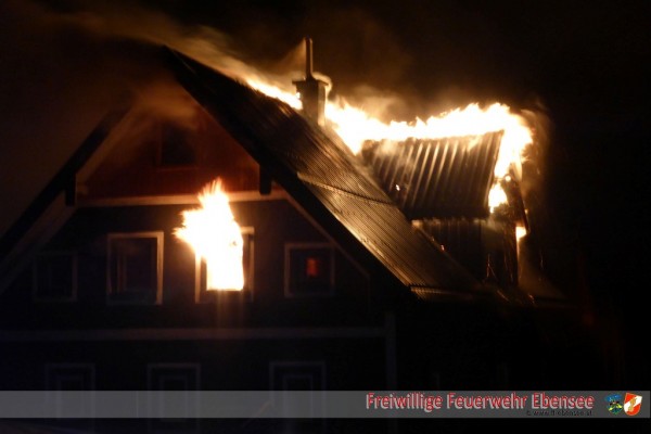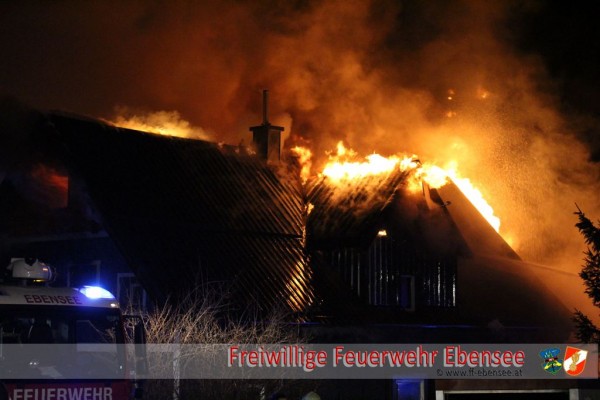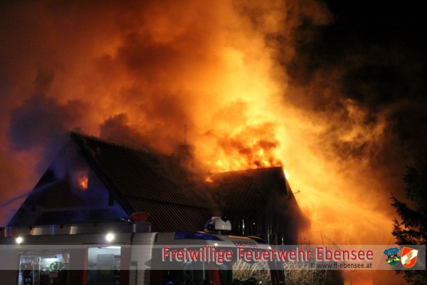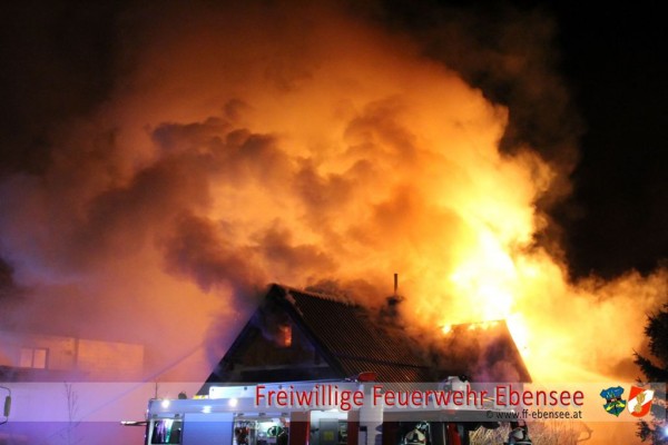 Gleich fünf Feuerwehren mussten am Abend des 2. Februar zu einem Wohnhausbrand in Ebensee ausrücken. Kurz vor 19.00 bemerkte der Feuerwehrkommandant der FF Langwies zufällig beim Vorbeifahren den Brand und alarmierte die Kollegen. Das Einfamilienhaus stand bereits lichterloh in Flammen, als die Feuerwehr Ebensee mit Einsatzleiter ABI Christoph Pilz eintraf. „Es hat schon das erste Obergeschoss gebrannt und auch beim Dach kamen die Flammen heraus, es war also schon ein fortgeschrittener Brand“, beschreibt der Kommandant der FF Ebensee die Lage.