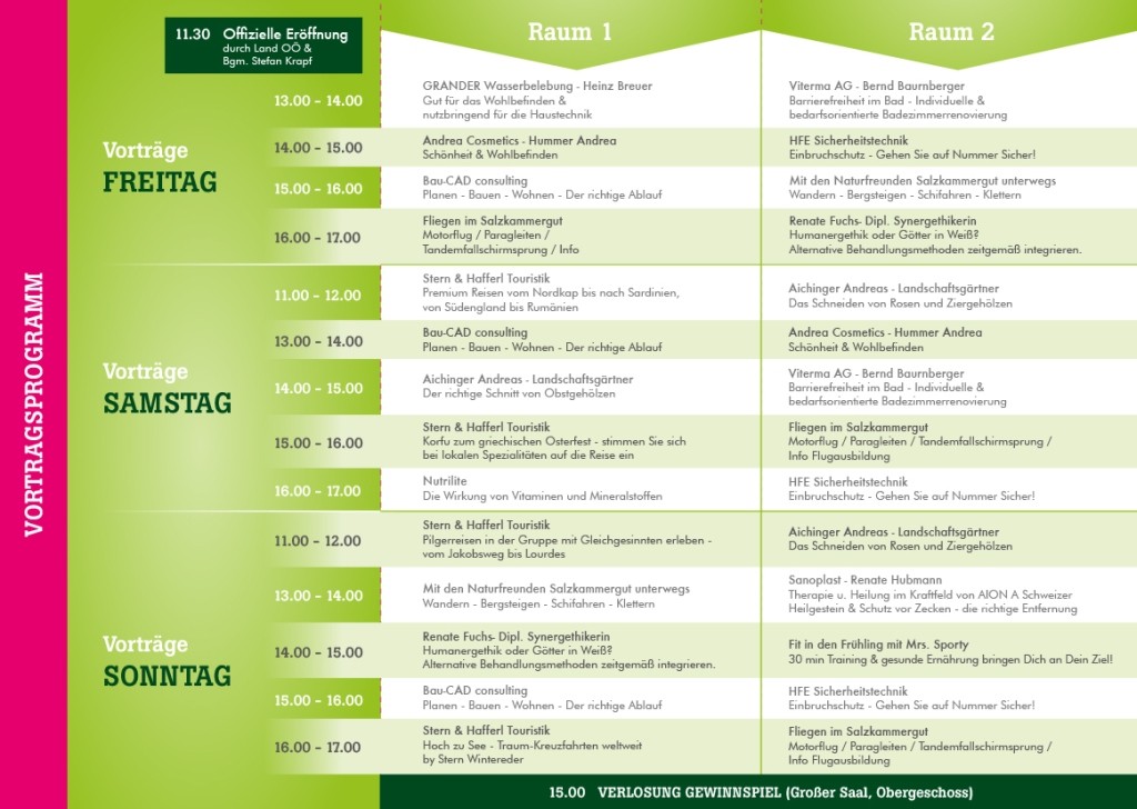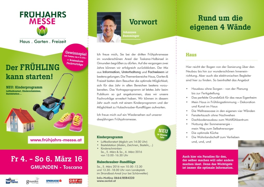 Organisator Johannes Bamminger blickt erfolgreich auf die vergangen zwei Jahre zurück und freut sich bereits auf die diesjährige Messe. „Der Mix aus Information, Unterhaltung und Fachwissen ist bestens gelungen. Die Themenbereiche Haus, Garten & Freizeit bieten dem Besucher die optimale Möglichkeit, sich für das Jahr in allen Bereichen bestens vorzubereiten. Das Vortragsprogramm ist letztes Jahr beim Publikum so gut angekommen, dass wir unsere Fachvorträge erweitert haben. Wir können in diesem Jahr auch noch mit einem Kinderprogramm und der Möglichkeit zu Hubschrauber-Rundflügen aufwarten.“