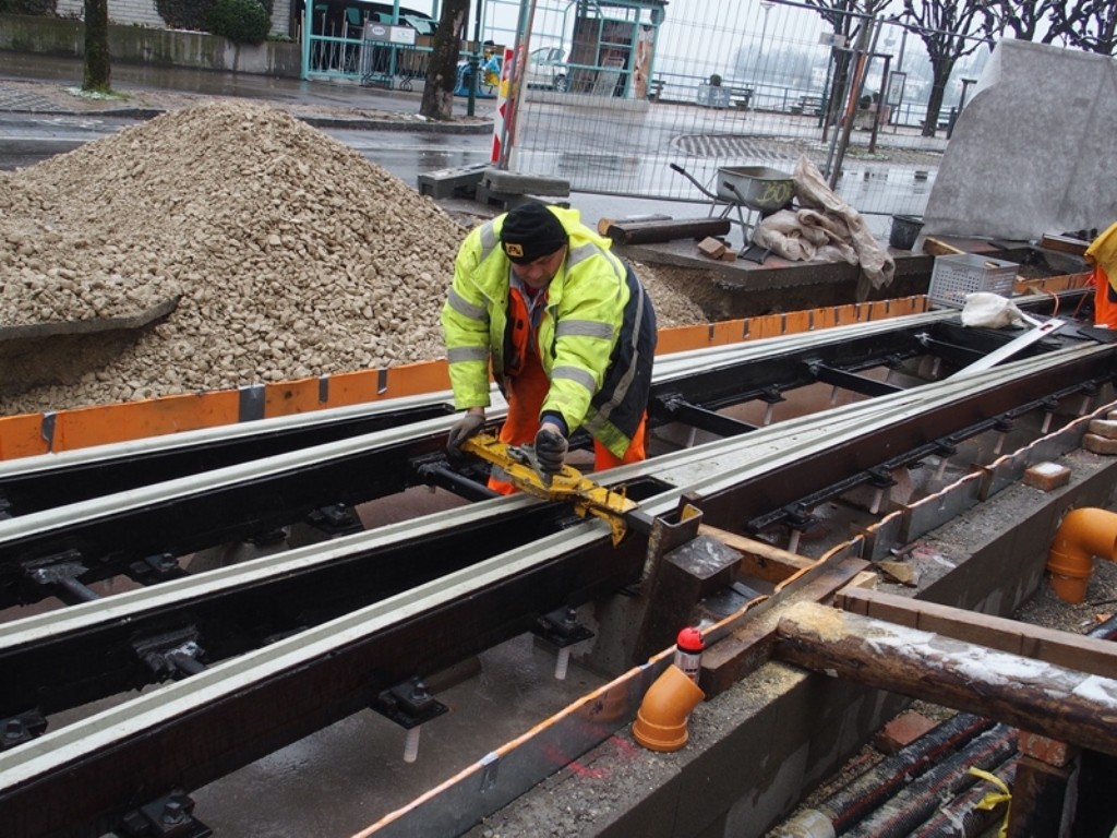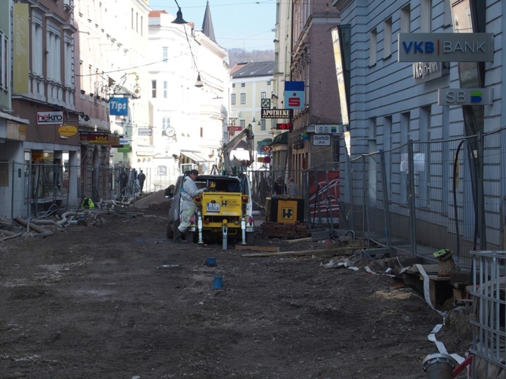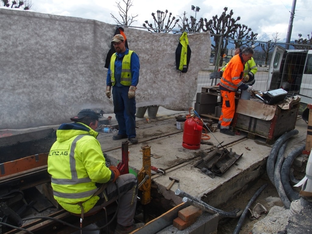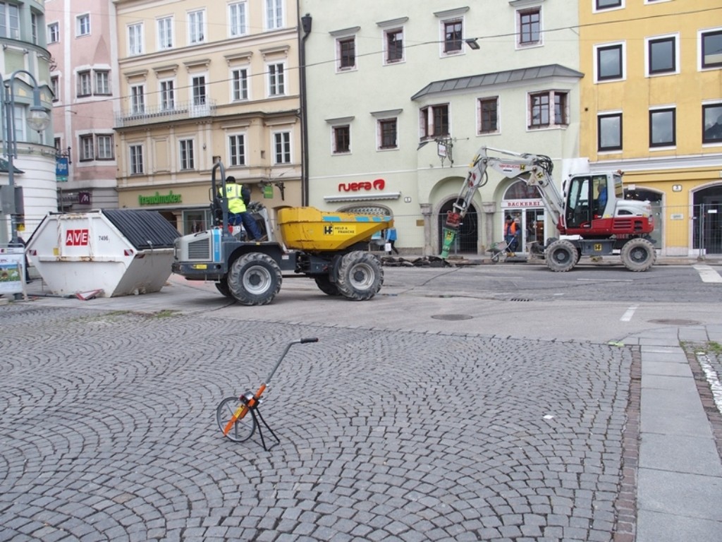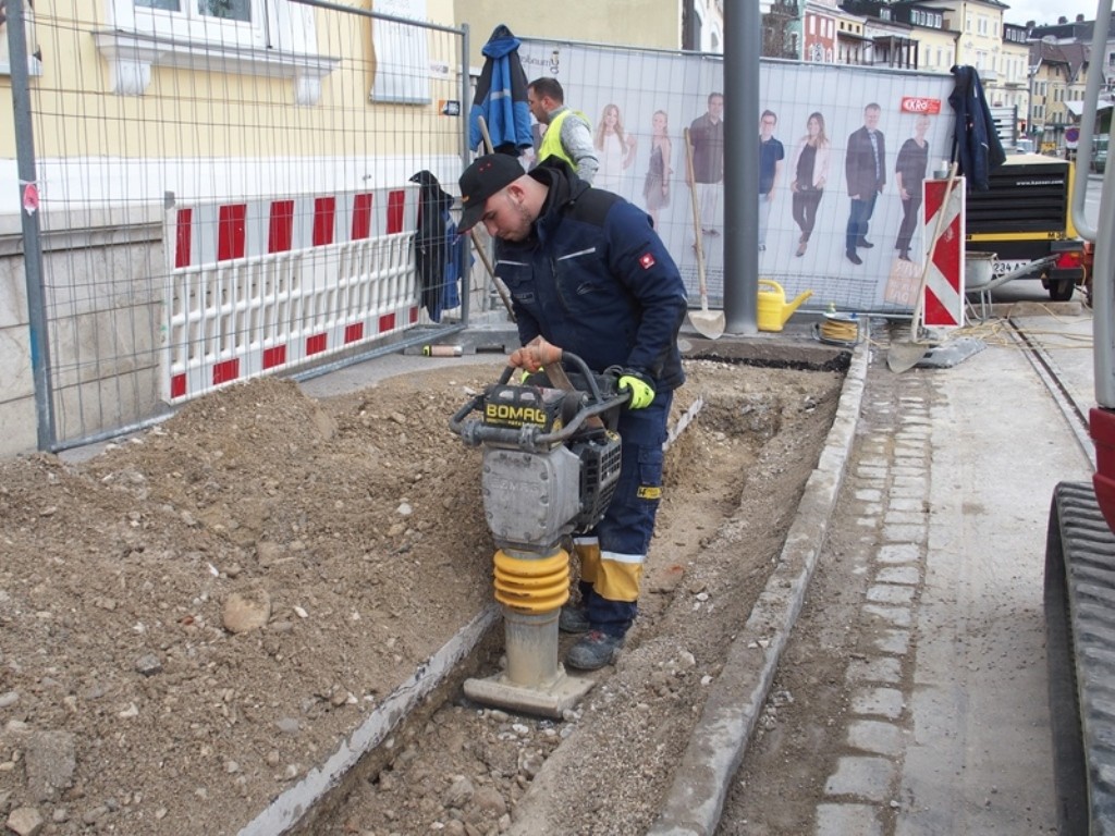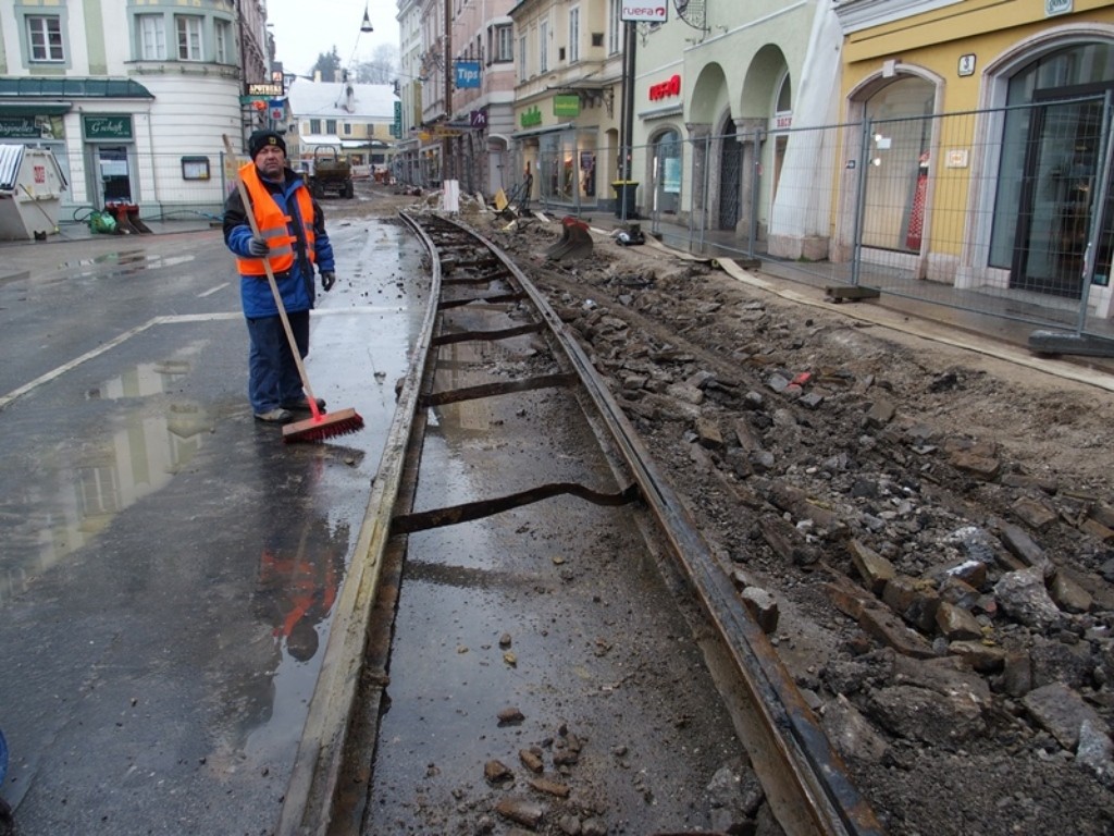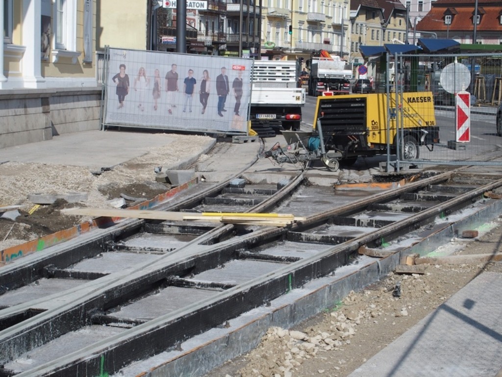 Am Franz-Josef-Platz erfolgte die Gleisabnahme der neuen Weiche, die nun auch schon einbetoniert wurde. Weiters wurden dort auch schon die Randleisten gesetzt und gepflastert.