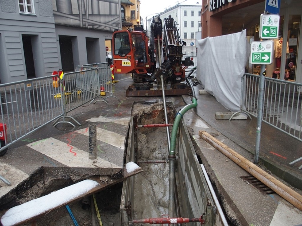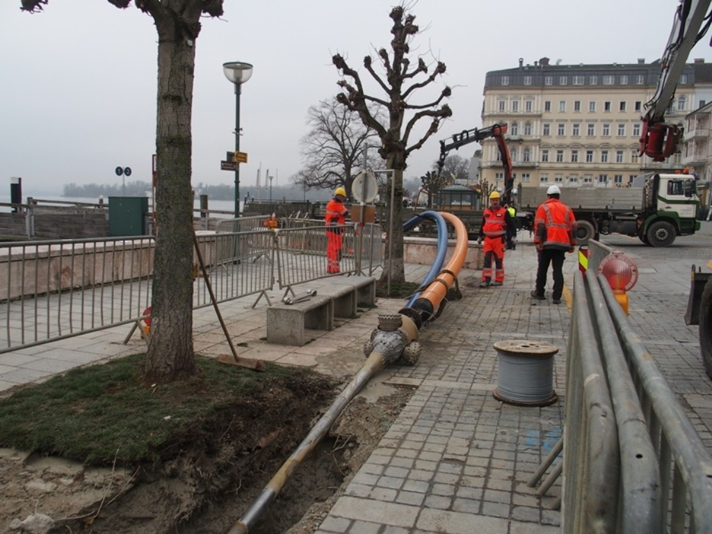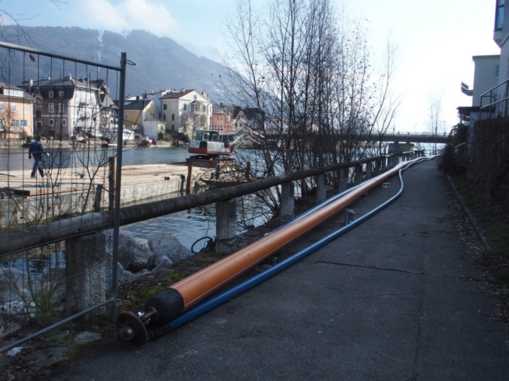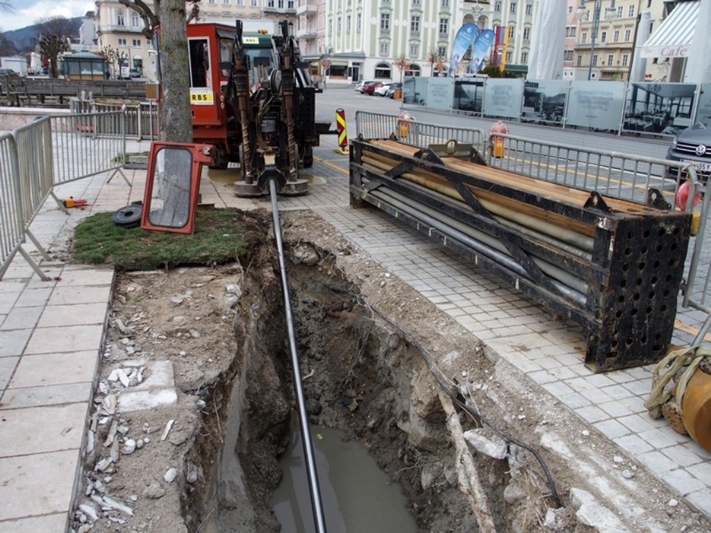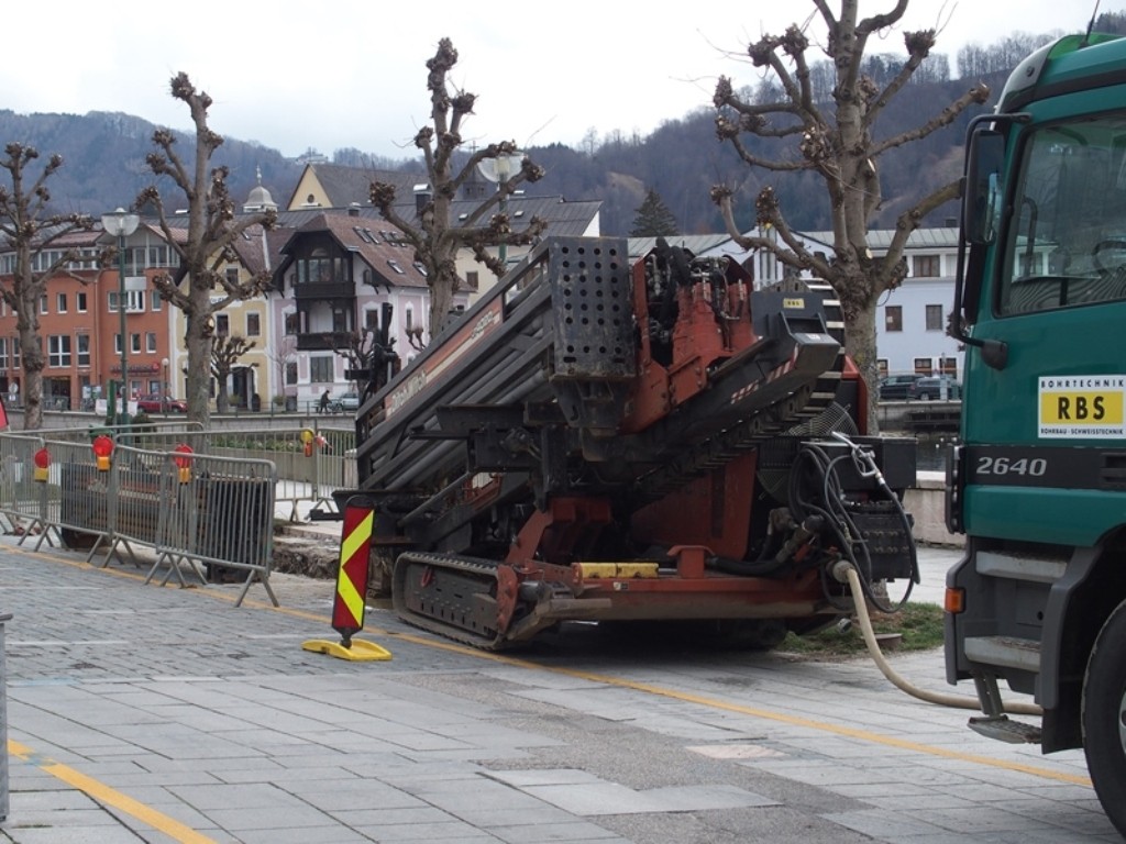 Eins der größten Highlights dieser Woche war aber auf jeden Fall das Abschließen des Punktes „Traunbohrung“ mit dem Einziehen der Leitungen unter dem See hindurch. Dafür mussten die Gasleitung und die beiden Wasserleitungen (eine davon für das Wasser des „Heiligen Bründls“) zuerst am Traunreiterweg zusammengeschweißt und von dort mit dem Schiff bis zum Einziehschacht am Rathausplatz gezogen werden. Schließlich wurden sie von dort aus durch das Bohrloch gezogen und kamen nach nur wenigen Stunden auf der anderen Seite beim Zielschacht neben Trachten Reingruber planmäßig zum Vorschein.