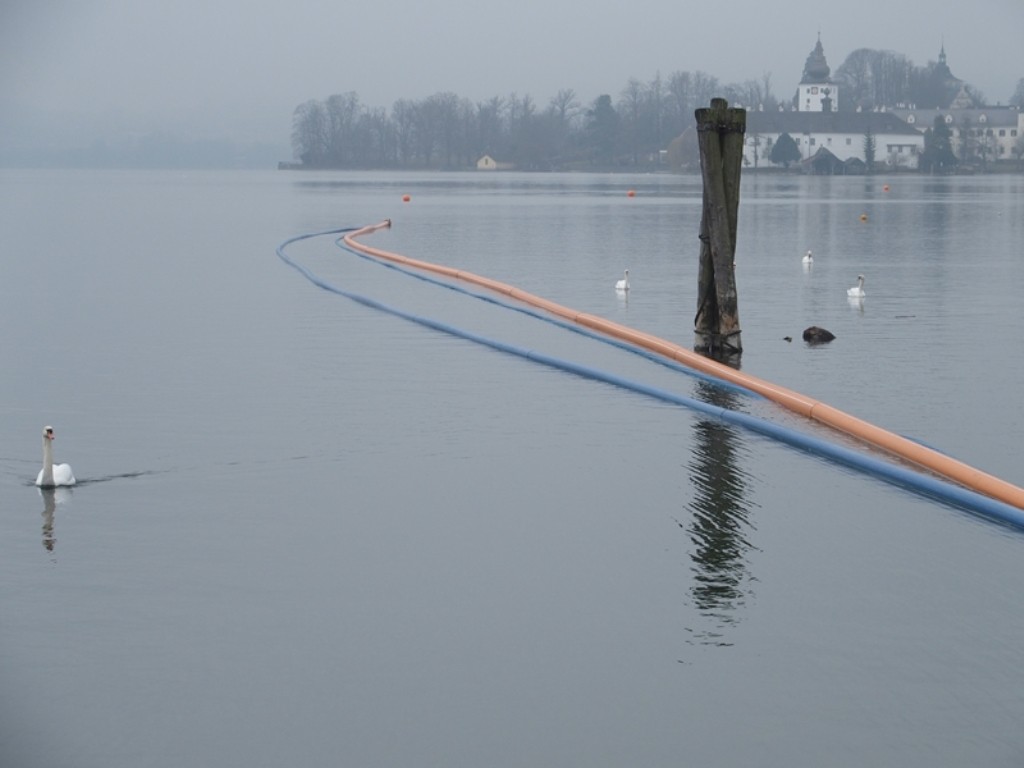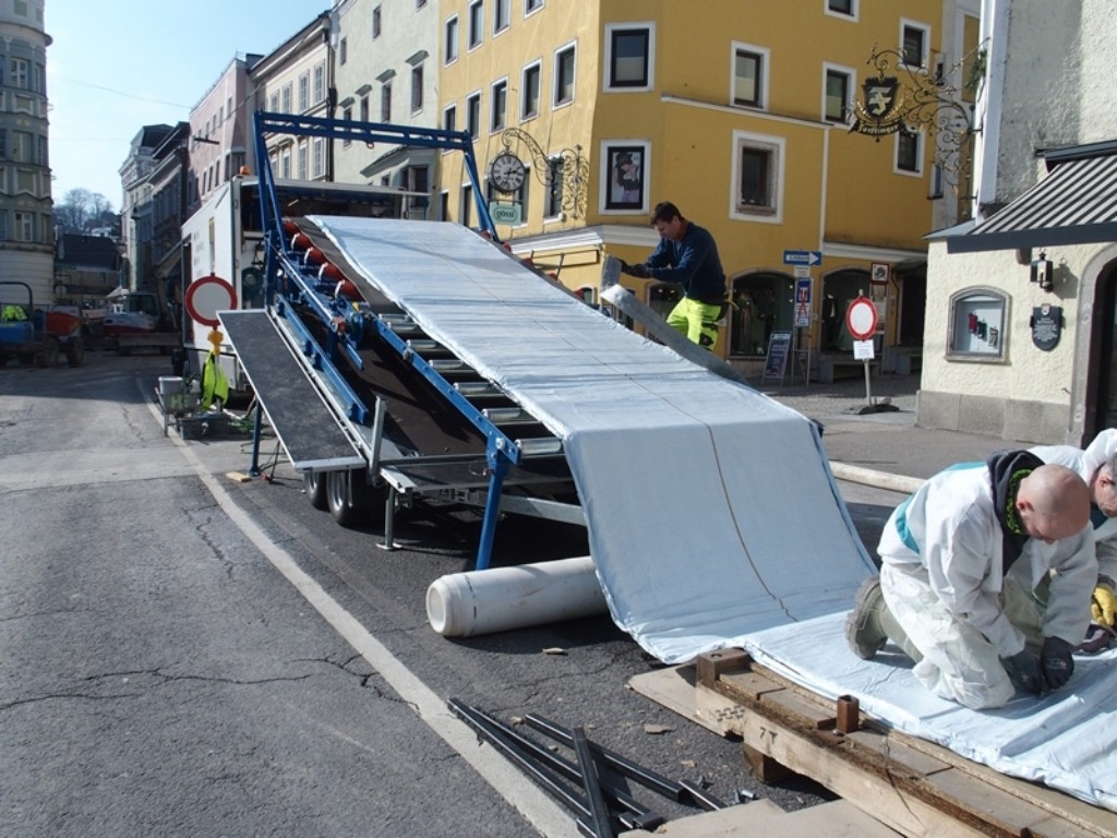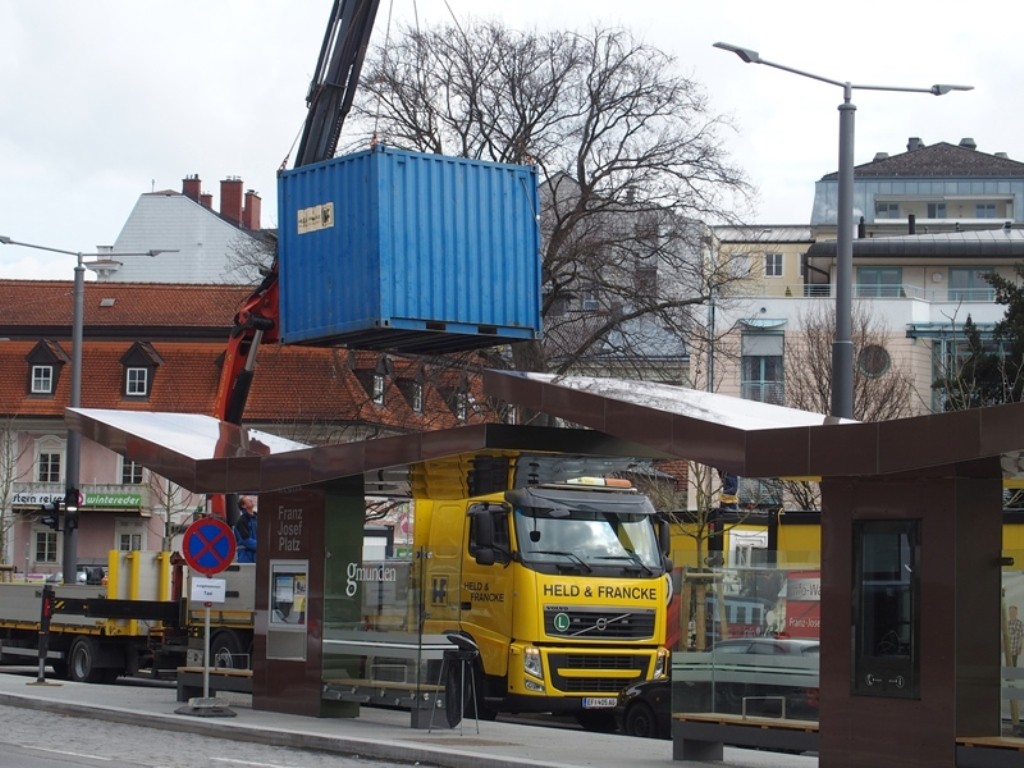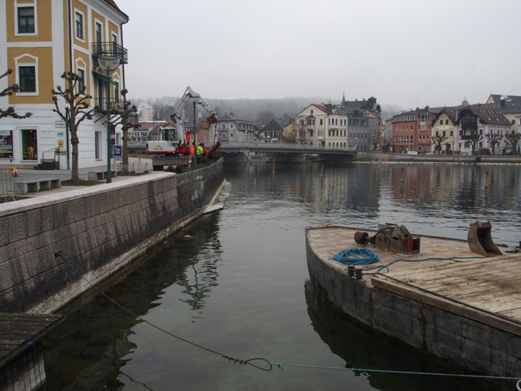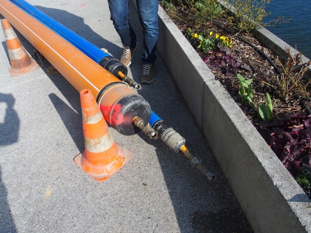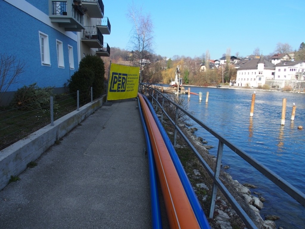 Eins der größten Highlights dieser Woche war aber auf jeden Fall das Abschließen des Punktes „Traunbohrung“ mit dem Einziehen der Leitungen unter dem See hindurch. Dafür mussten die Gasleitung und die beiden Wasserleitungen (eine davon für das Wasser des „Heiligen Bründls“) zuerst am Traunreiterweg zusammengeschweißt und von dort mit dem Schiff bis zum Einziehschacht am Rathausplatz gezogen werden. Schließlich wurden sie von dort aus durch das Bohrloch gezogen und kamen nach nur wenigen Stunden auf der anderen Seite beim Zielschacht neben Trachten Reingruber planmäßig zum Vorschein.