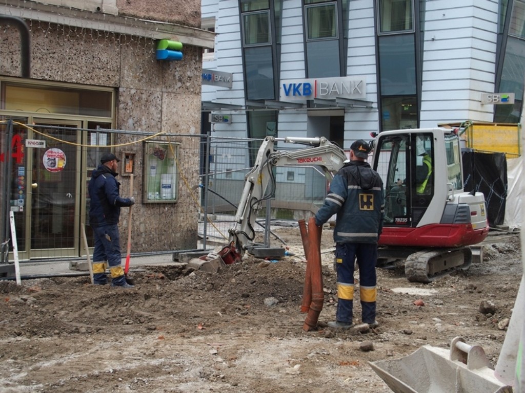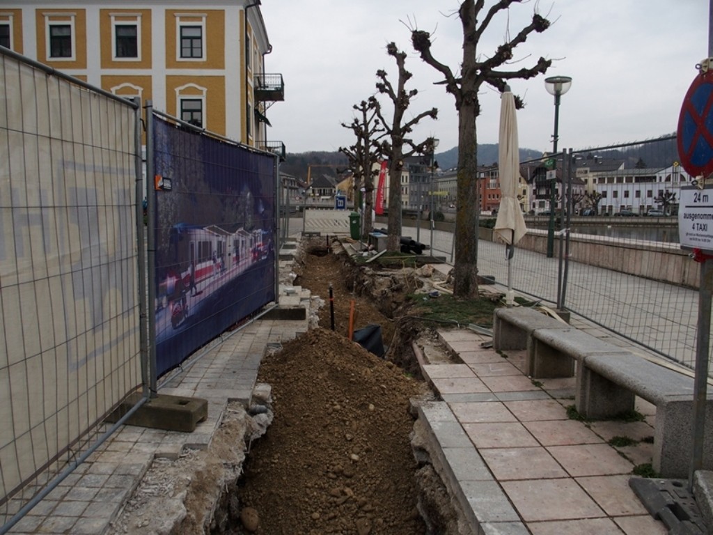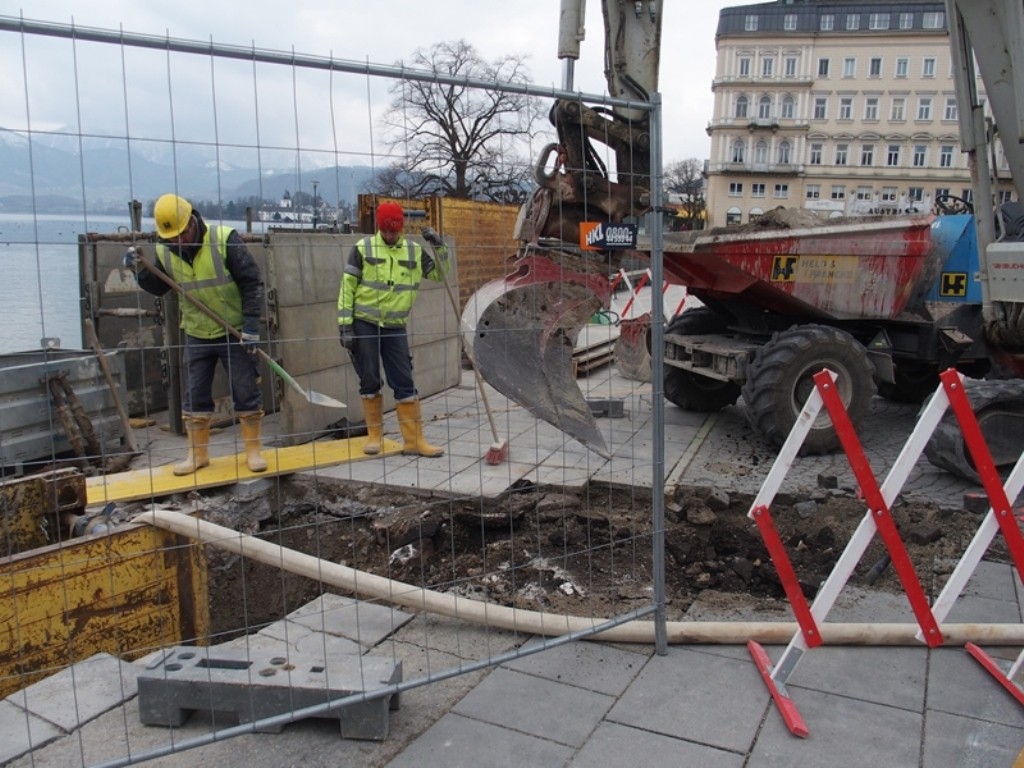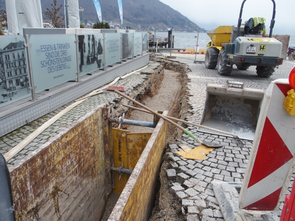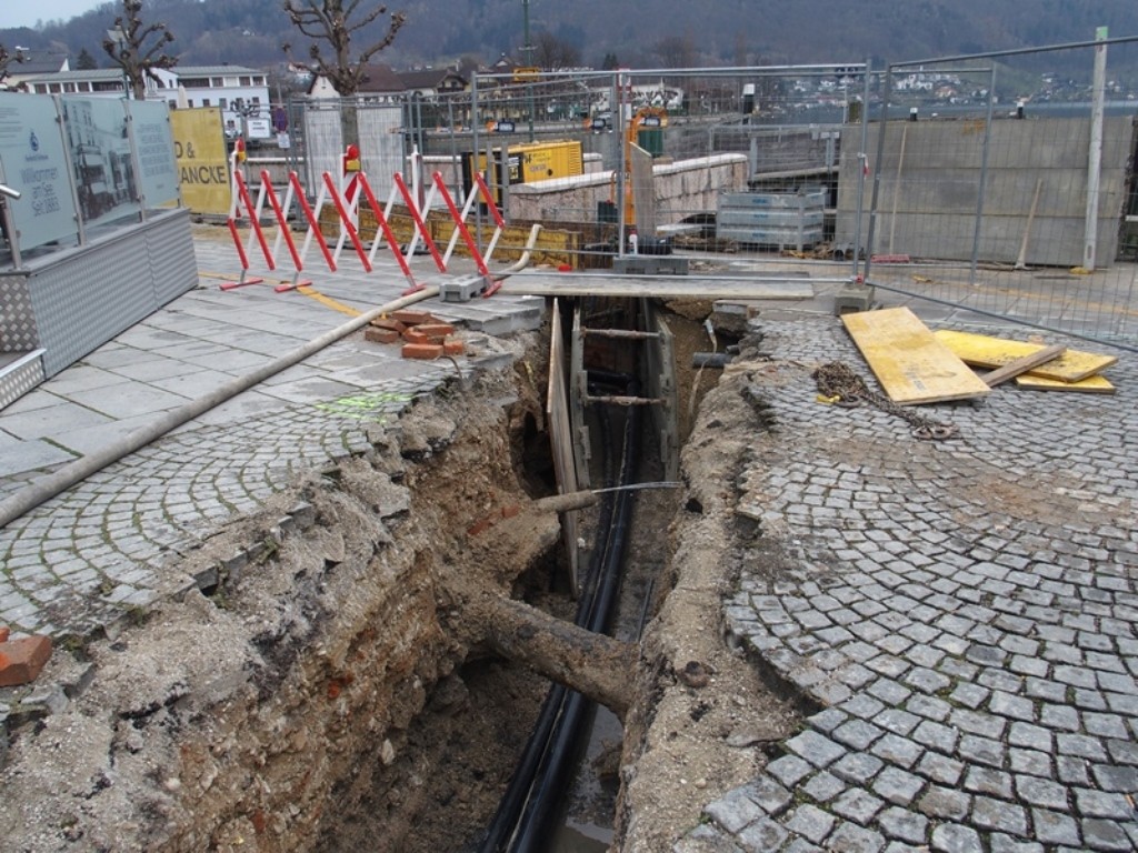 Am Rathausplatz, entlang des Hotels Schwan, wurde der Großteil der Künette für die Gas- und Wasserleitungen gegraben. So werden bald die neuen Leitungen, die bereits unter dem See verlegt wurden, mit der Innenstadt verbunden werden können.