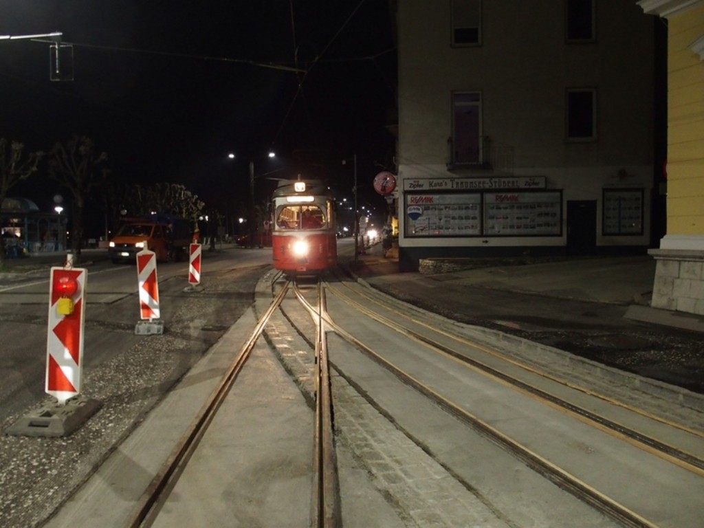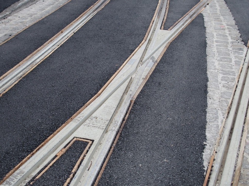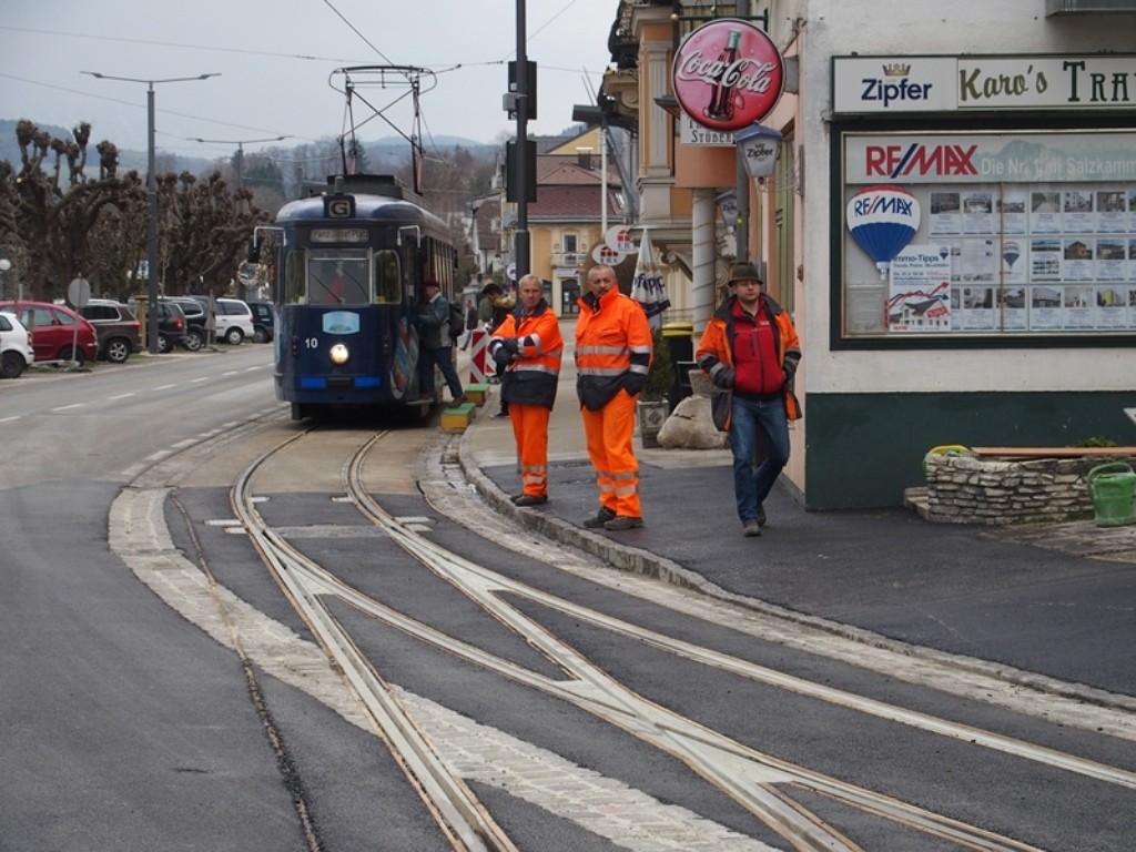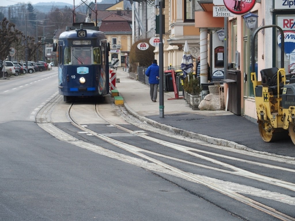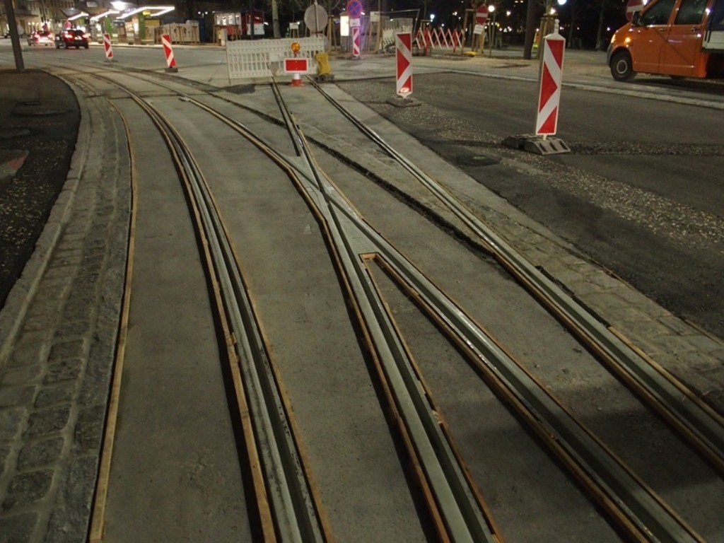 Im Bereich der neuen Weiche konnten in dieser Woche der Feinasphalt eingebaut und die Fugen vergossen werden. Der Trenner in der Fahrleitung wurde wieder entfernt und die Straßenbahn erreicht nun wieder ihre Haltestelle am Franz-Josef-Platz.